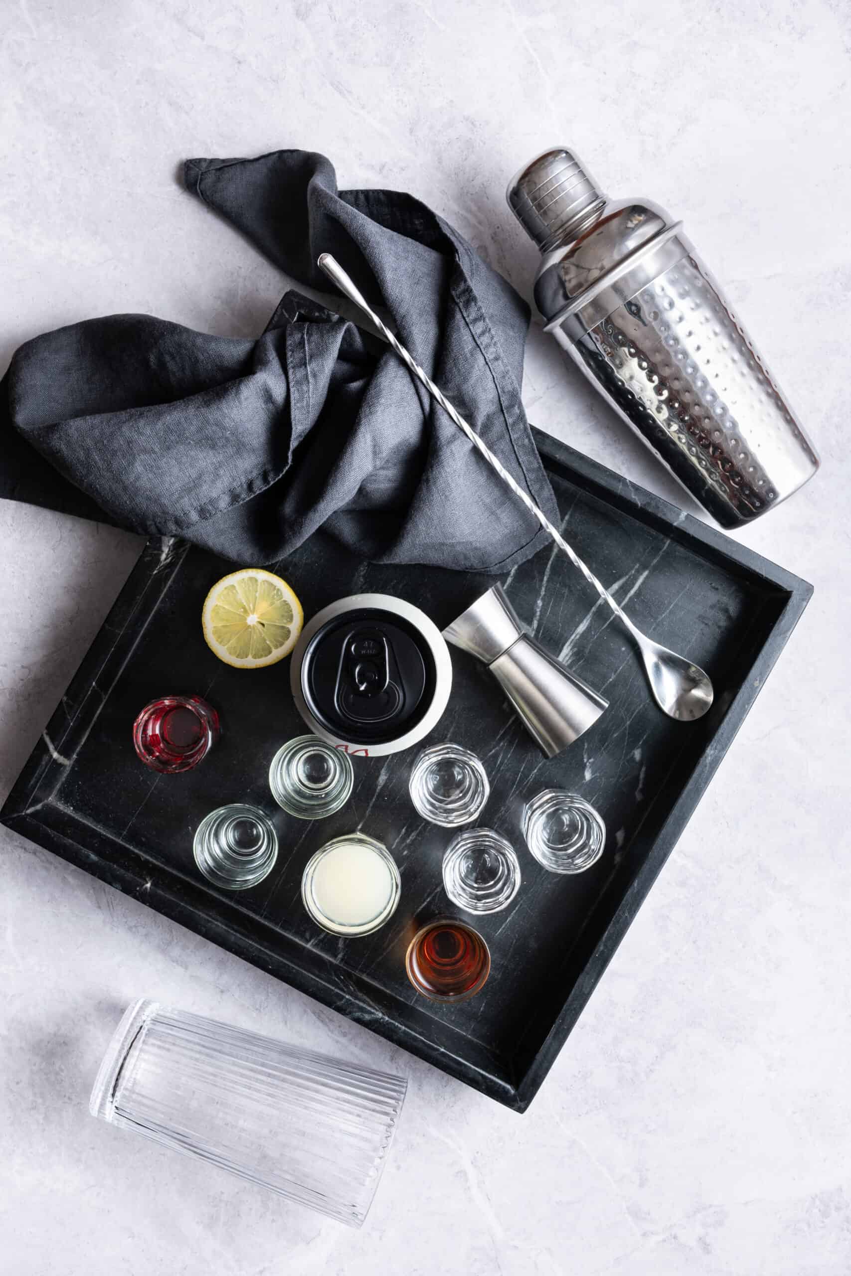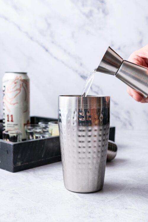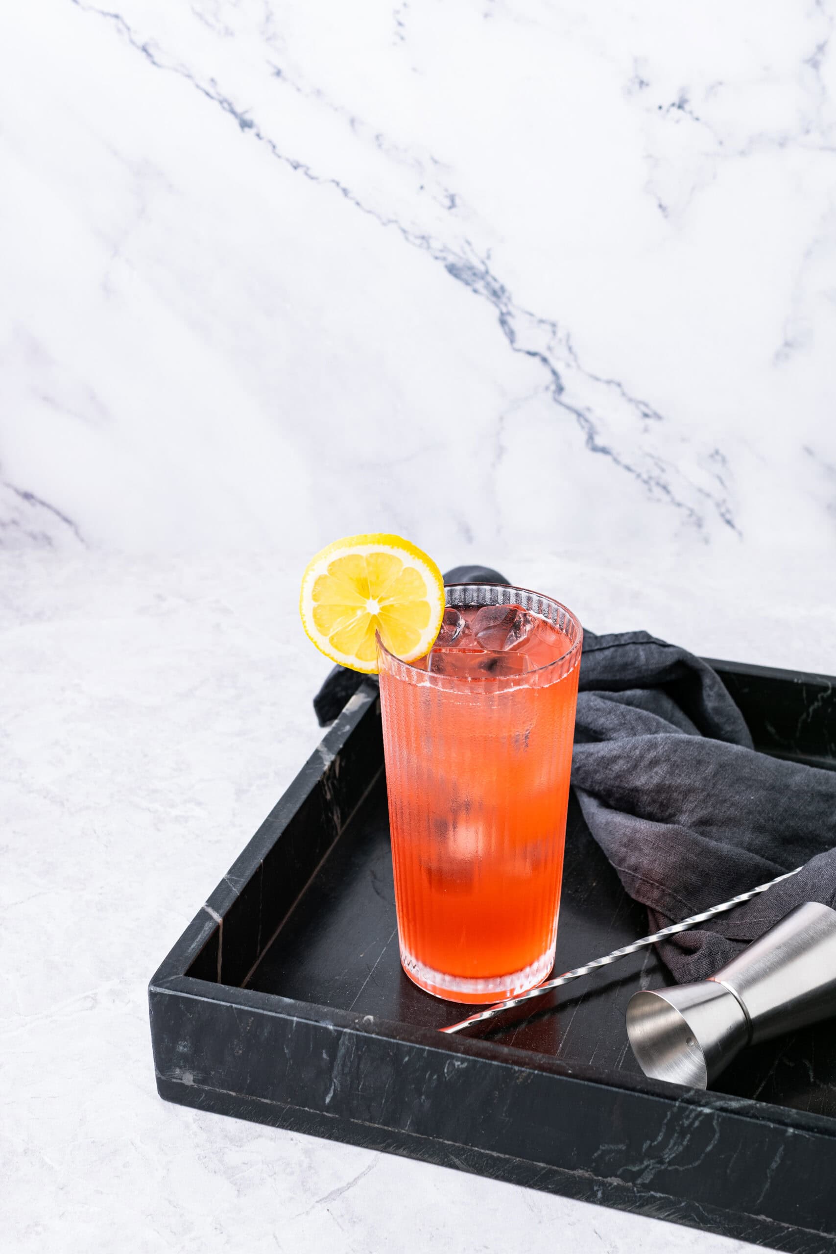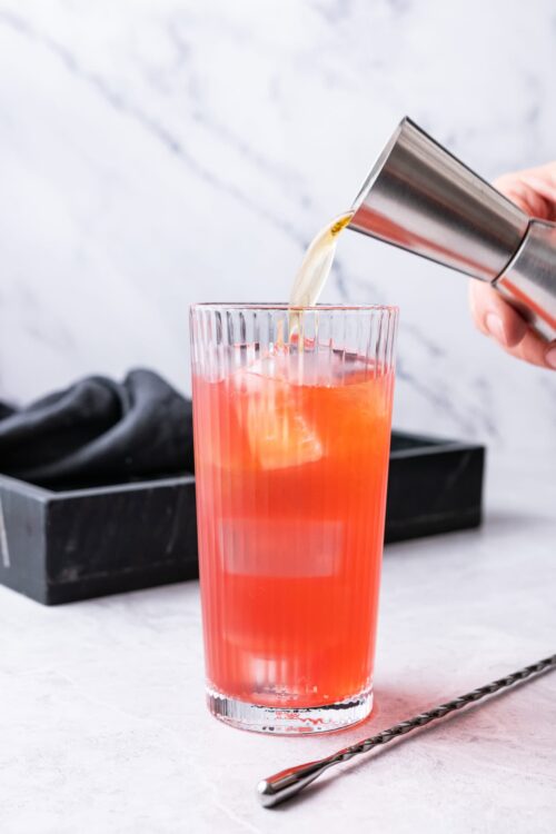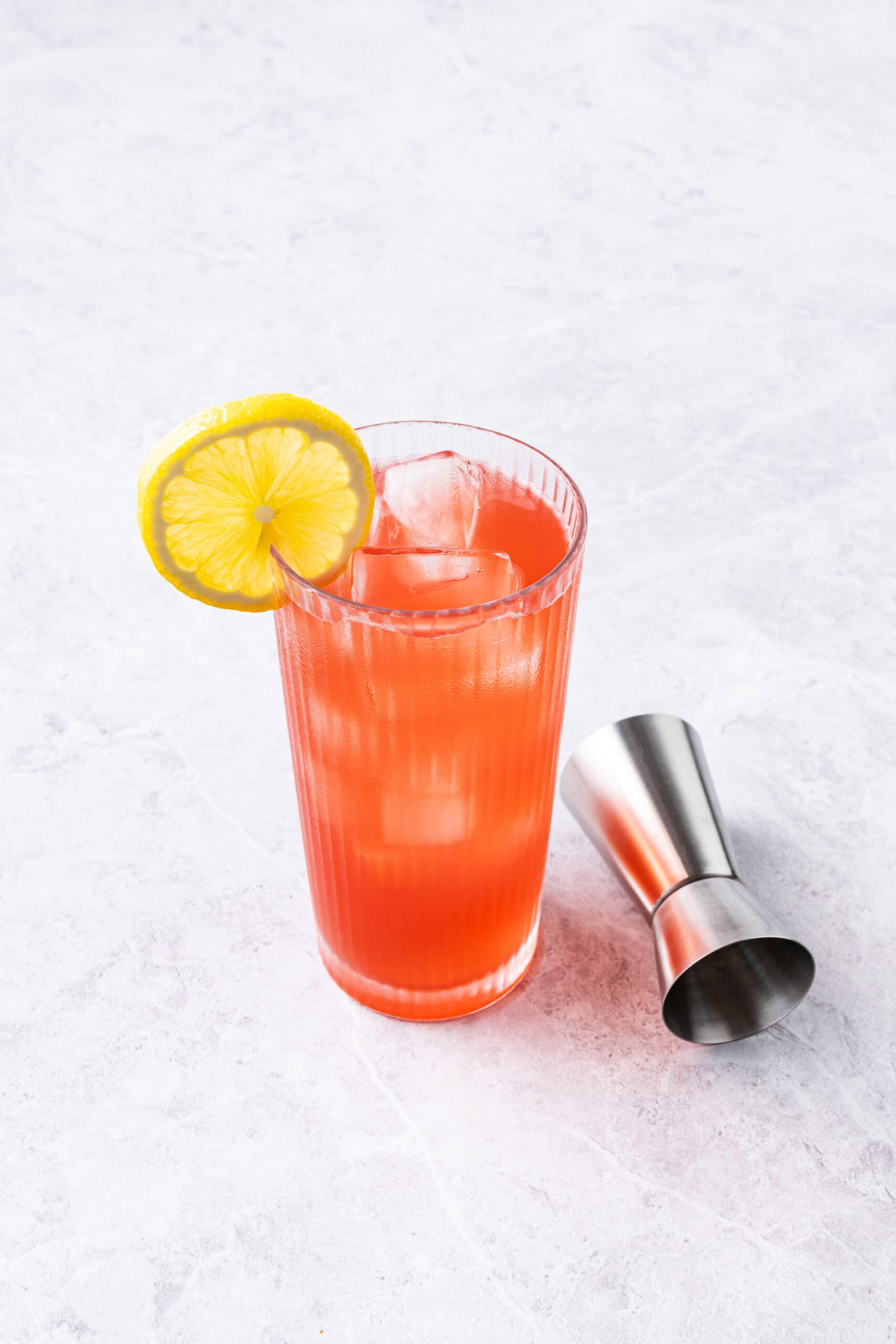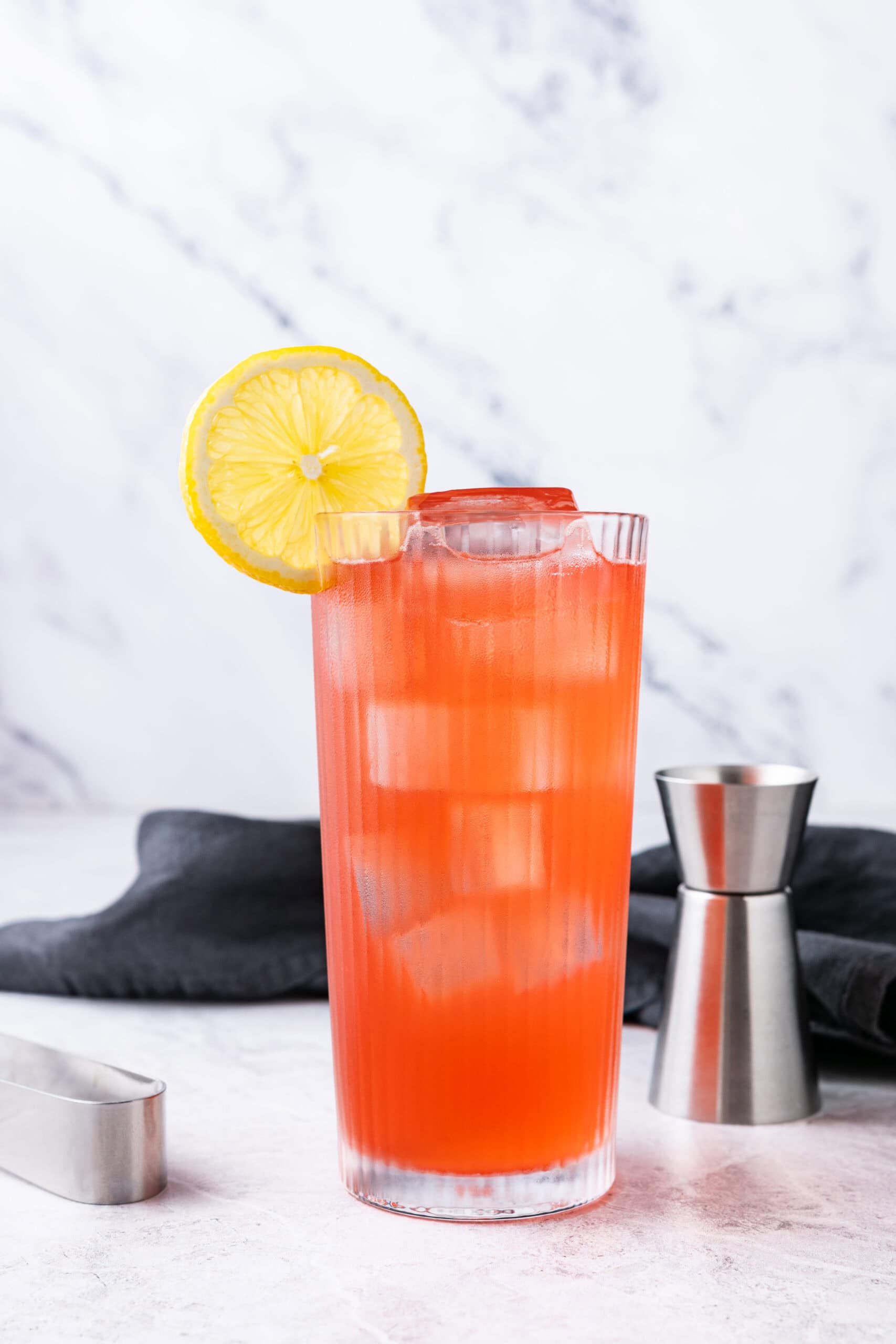 This red-colored and VERY potent mixture features a bevy of booze. Gin, white rum, vodka, triple sec, peach liqueur, amaretto, all sloshing together with sweet-and-sour mix, grenadine and topped with a splash of beer… Whew, that’s truly a mouthful. With so much going on, it’s probably best that you choose more cost-effective bottles of spirits instead of the pricier top-shelf brands.