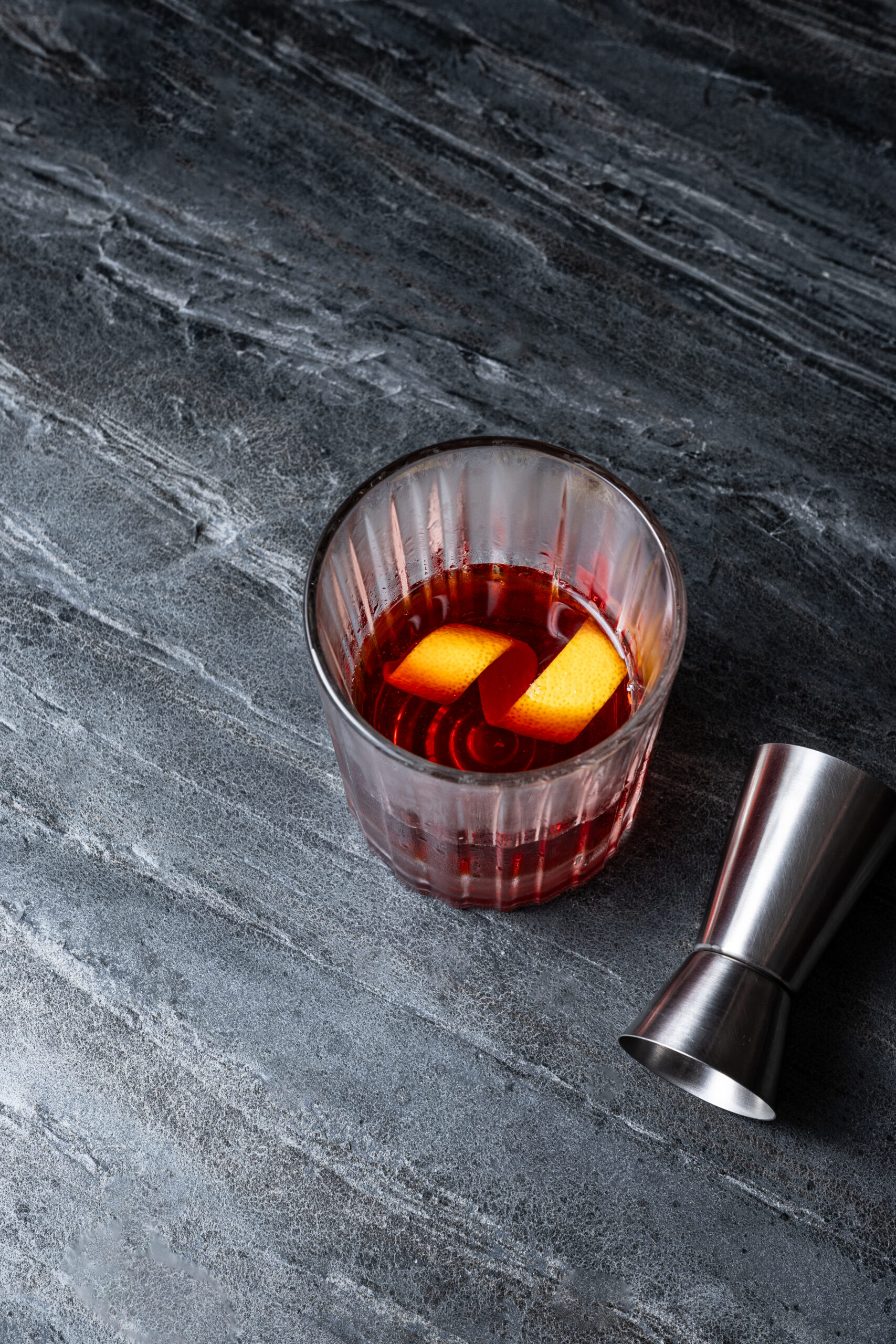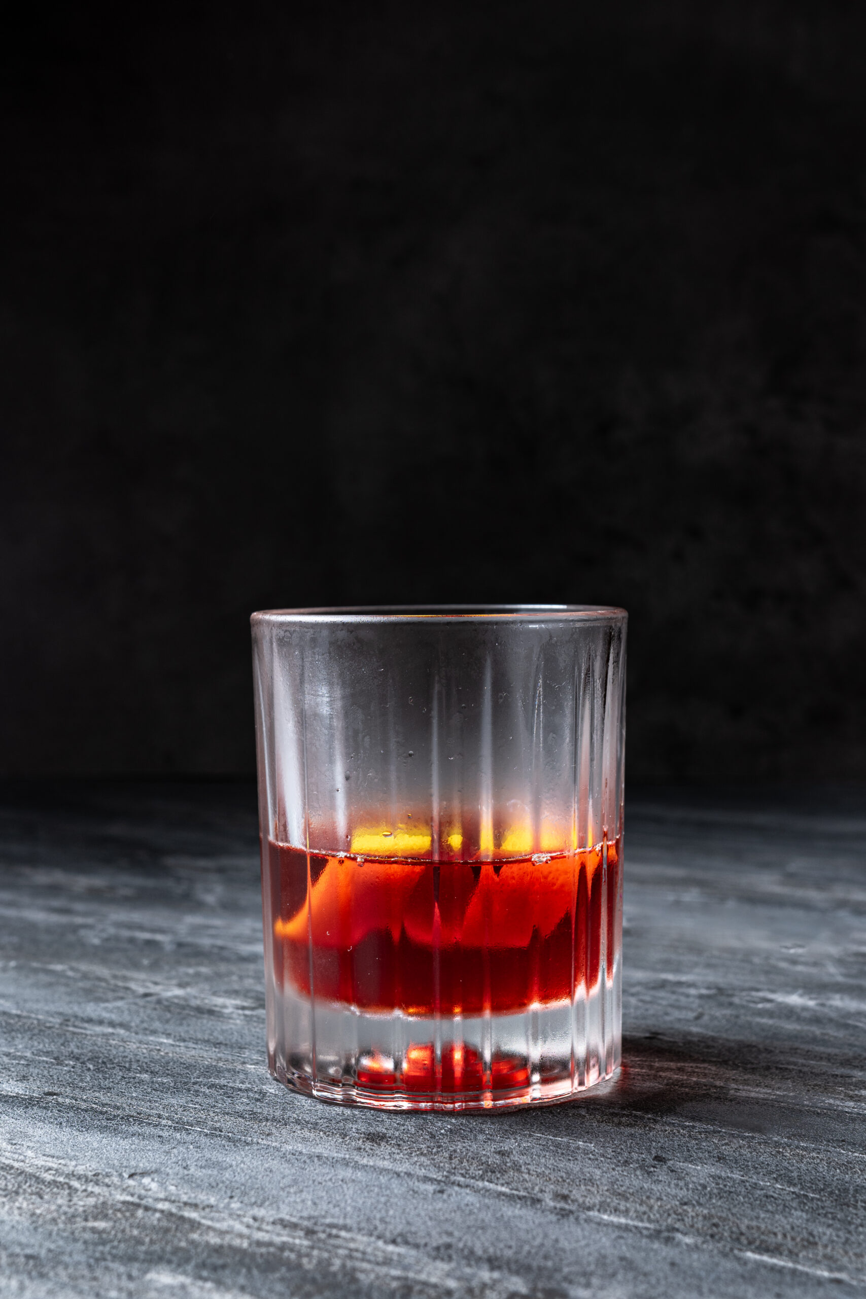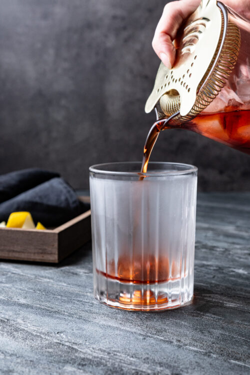 Chill a rocks glass in your freezer a bit before pouring your drink into it. Once it’s ready to sip, express the oils of a lemon twist over it and drop it in for garnish.