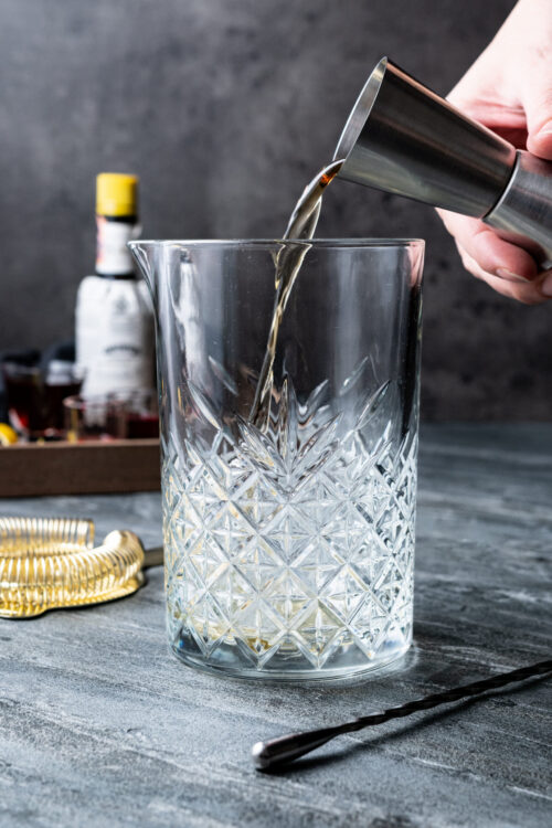 It is best to stir this drink in a mixing glass. The finished result will be silky and clear. Shaking it would froth it a little and you’ll end up with a cloudy concoction.