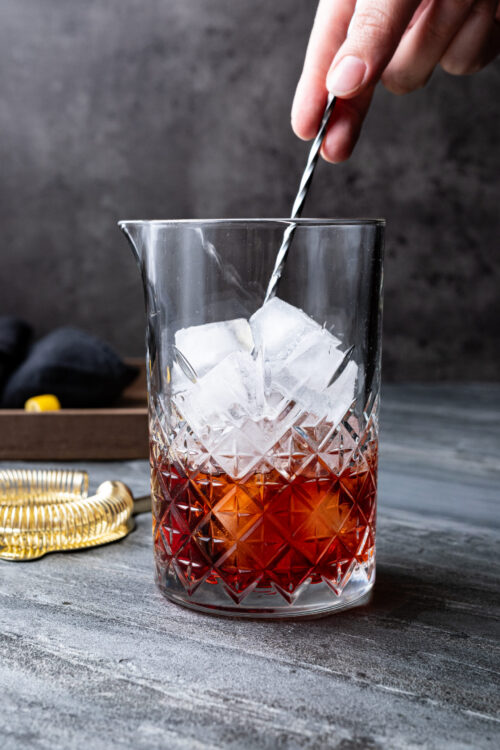 - Fill the mixing glass about 3/4 full with ice. Stir for 20 seconds to chill the drink.