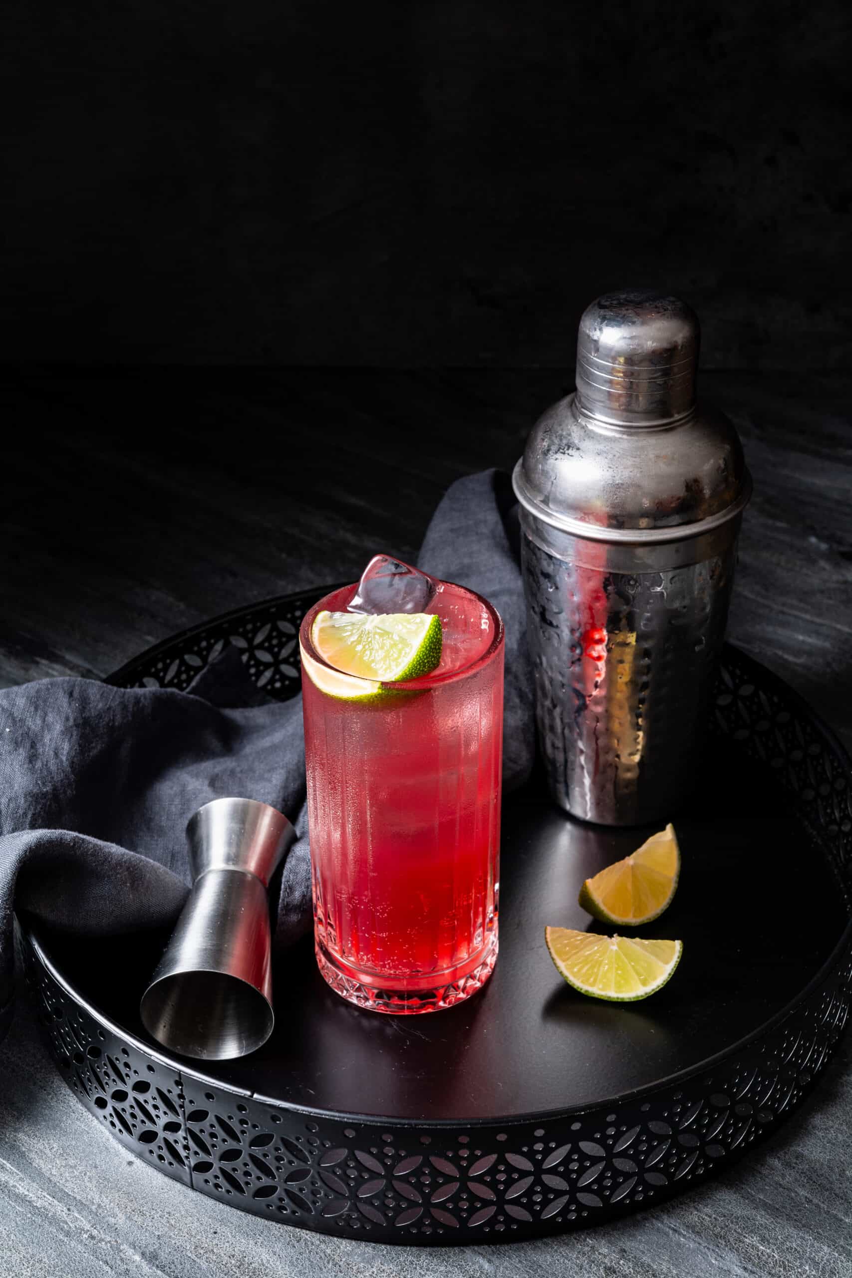 Chill a tall and slender highball or collins glass and fill it with ice. You’ll notice the slim shape of your glassware will keep your ice cubes from melting too fast. Garnish the rim with a lime wheel and pop a maraschino cherry on top.
