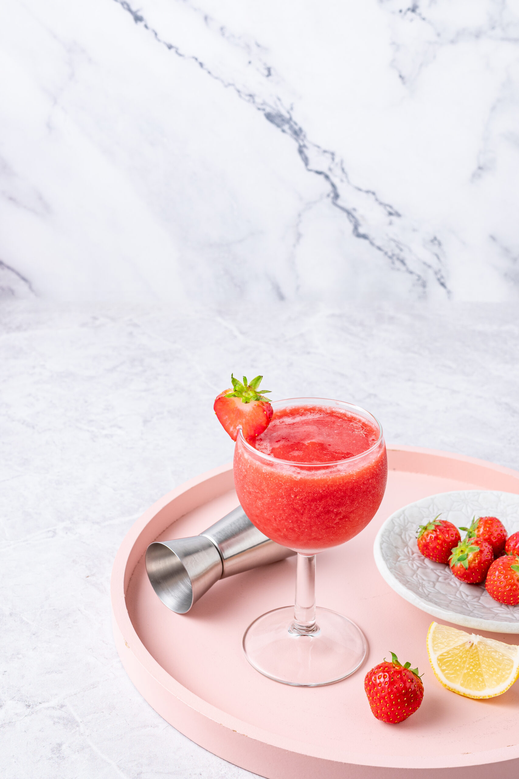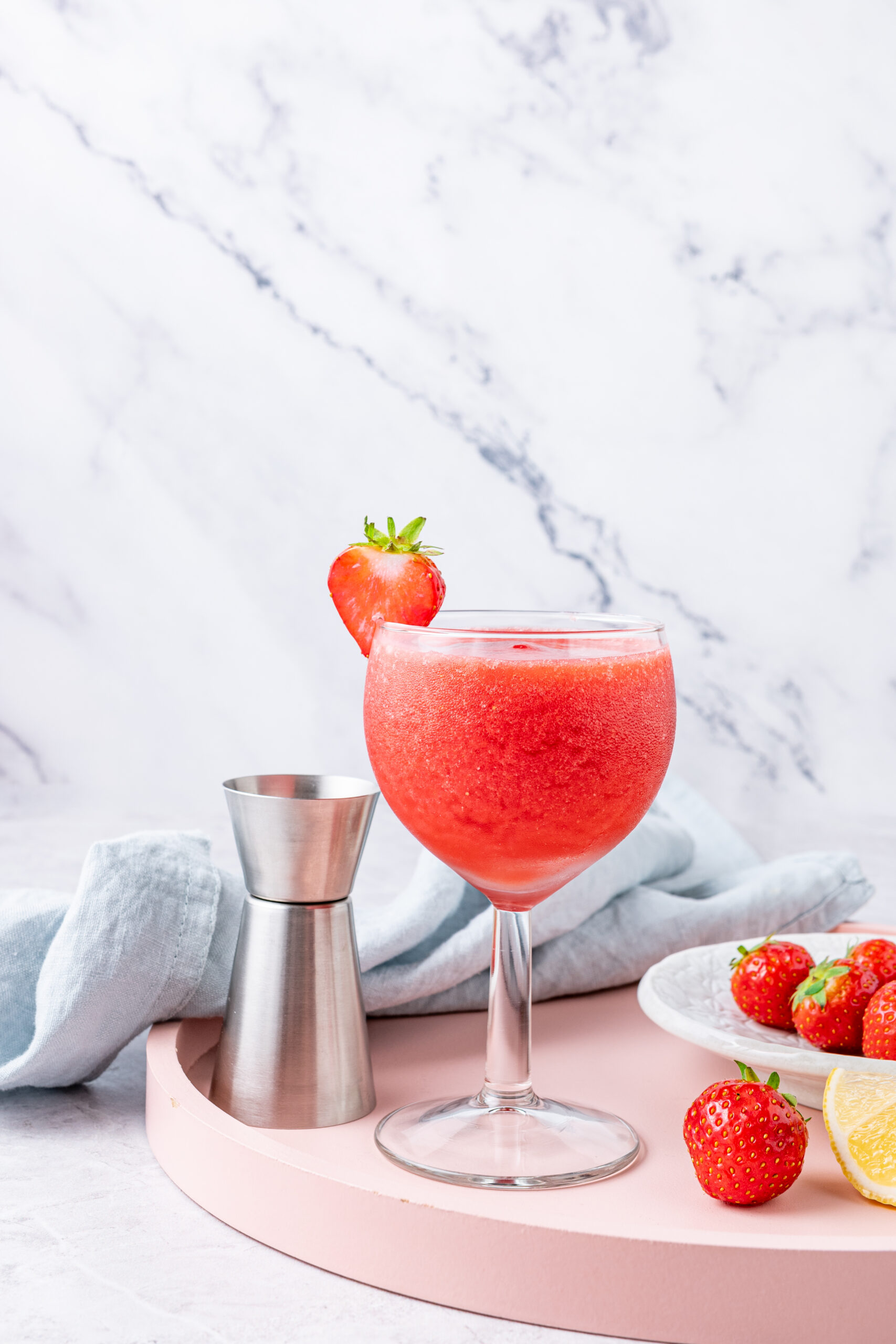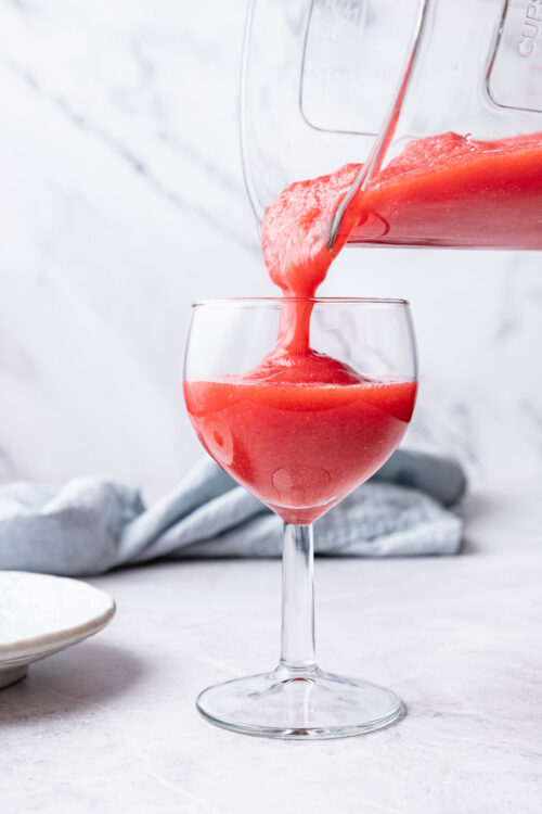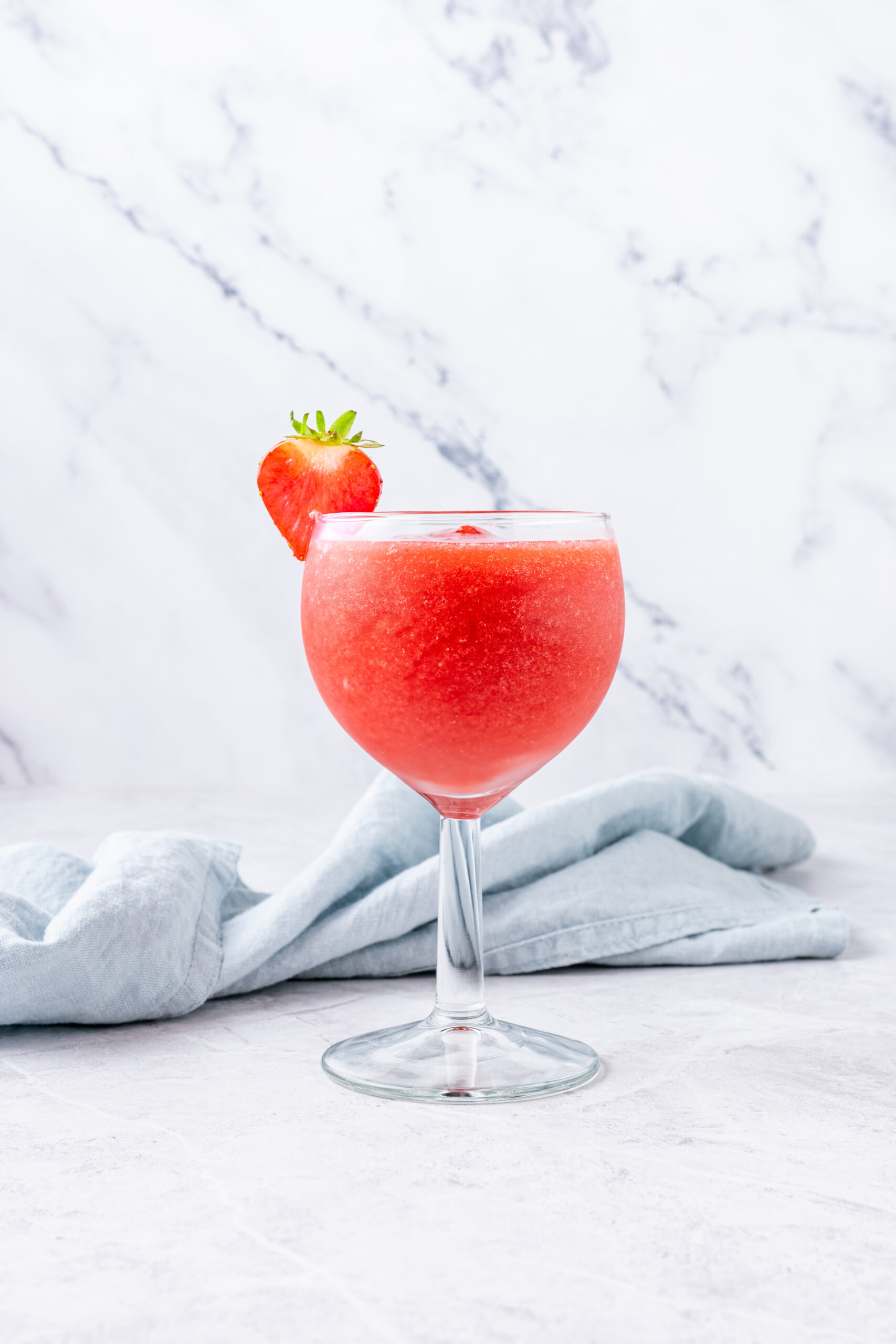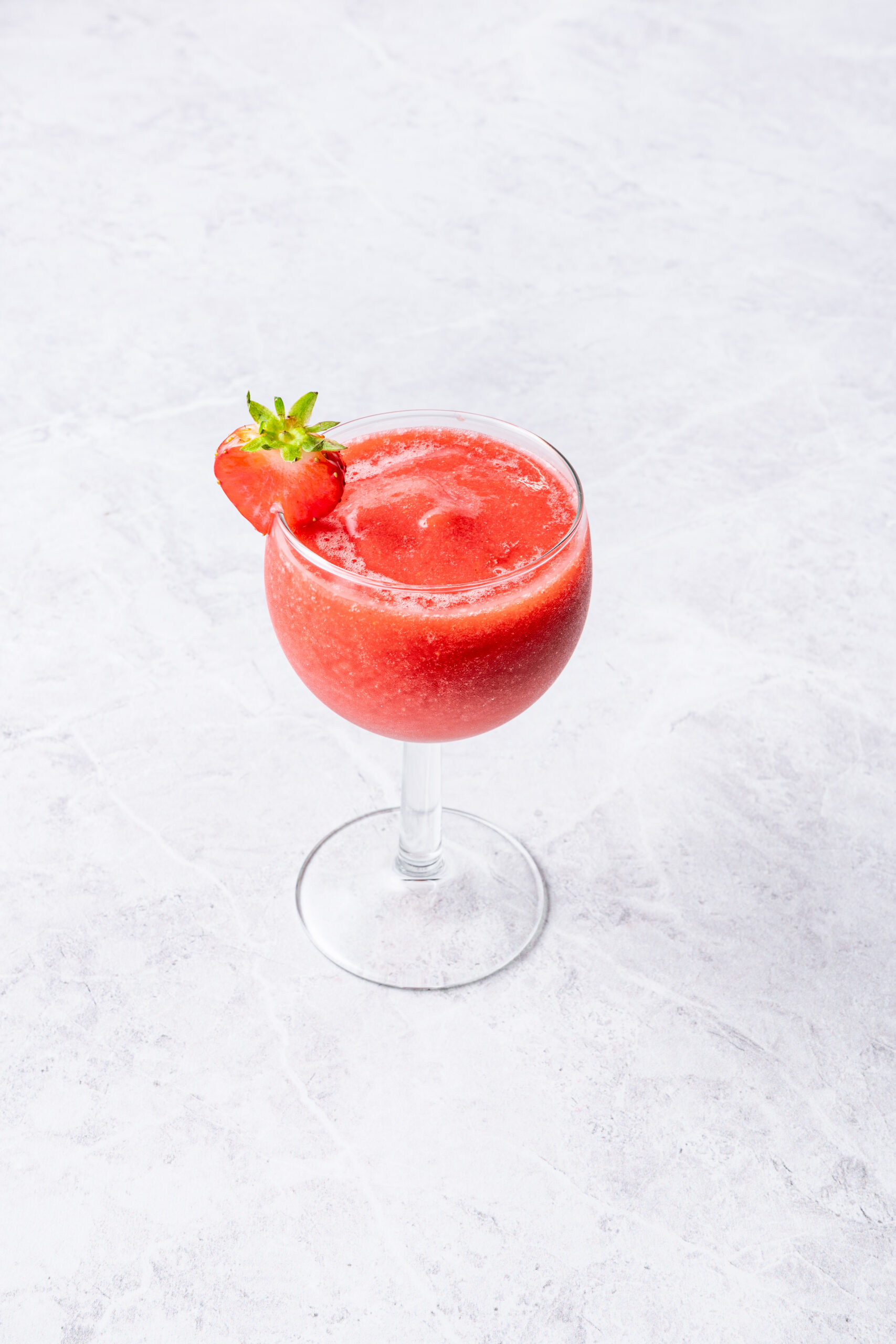 Pour your finished frozen beverage into a long-stemmed wine glass. Hold onto the stem to ensure your fingers don’t warm up your drink too quickly as you sip, and garnish the rim of your glass with a fresh slice of strawberry.