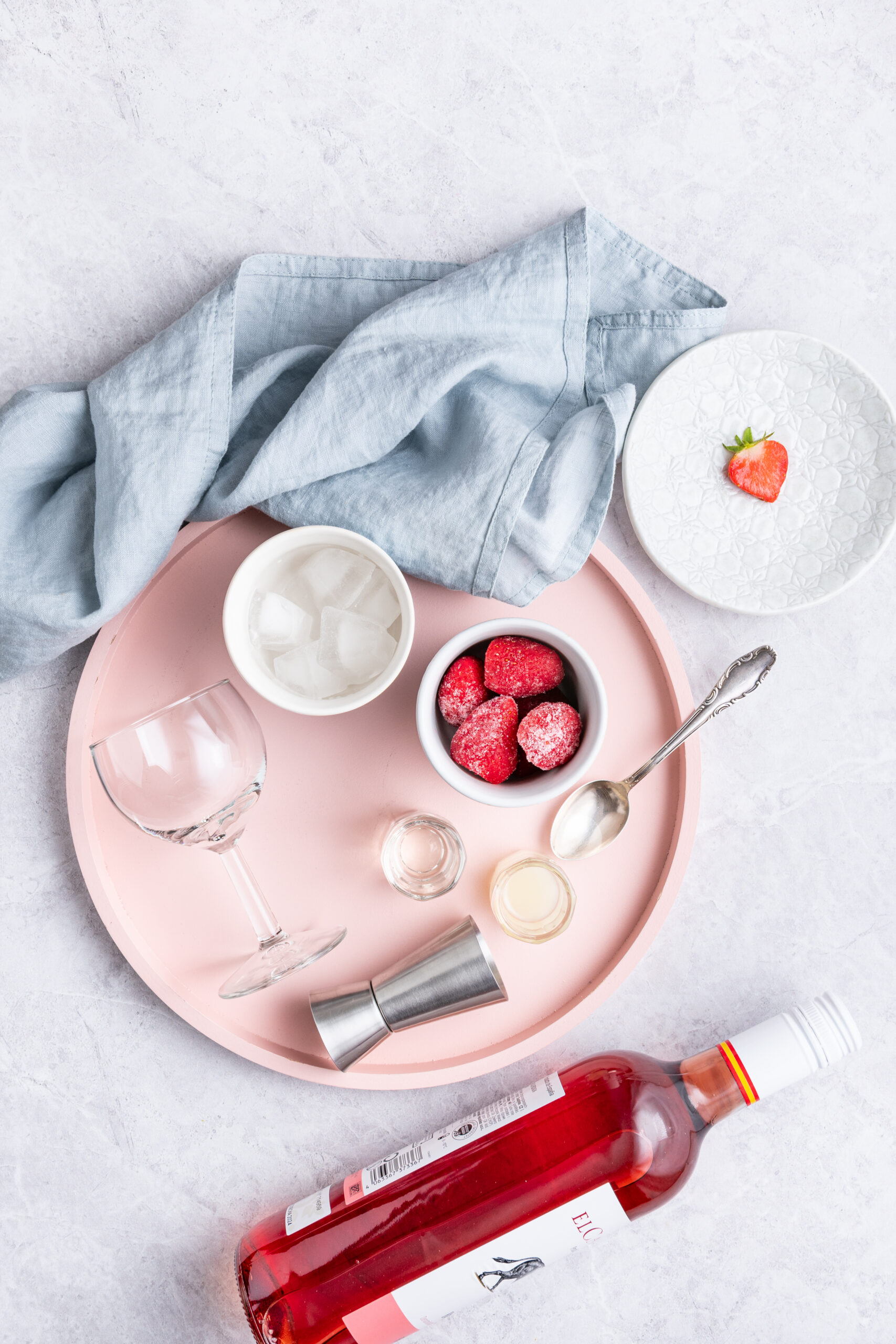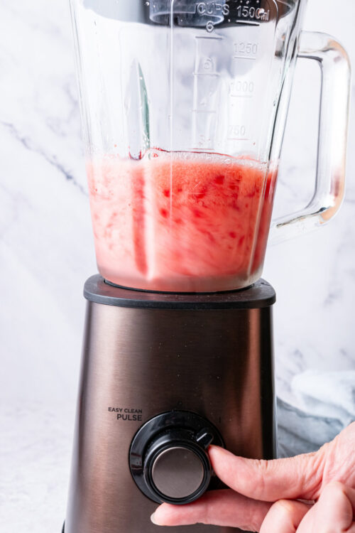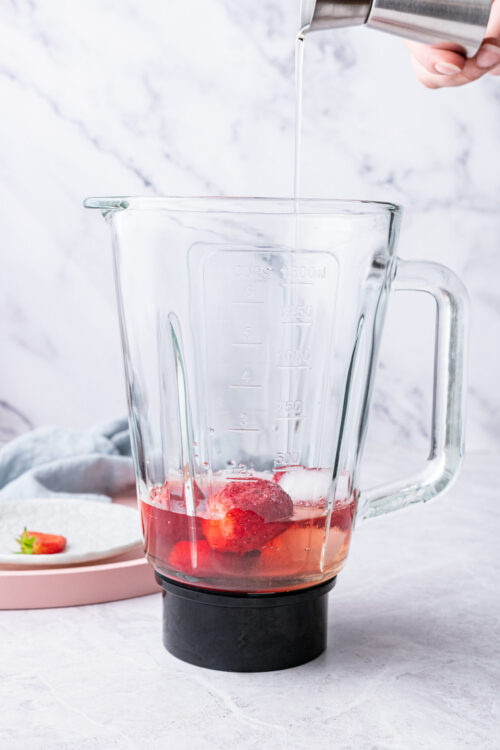 - Add the rosé, frozen strawberries, ice, simple syrup, and lemon juice to a blender.