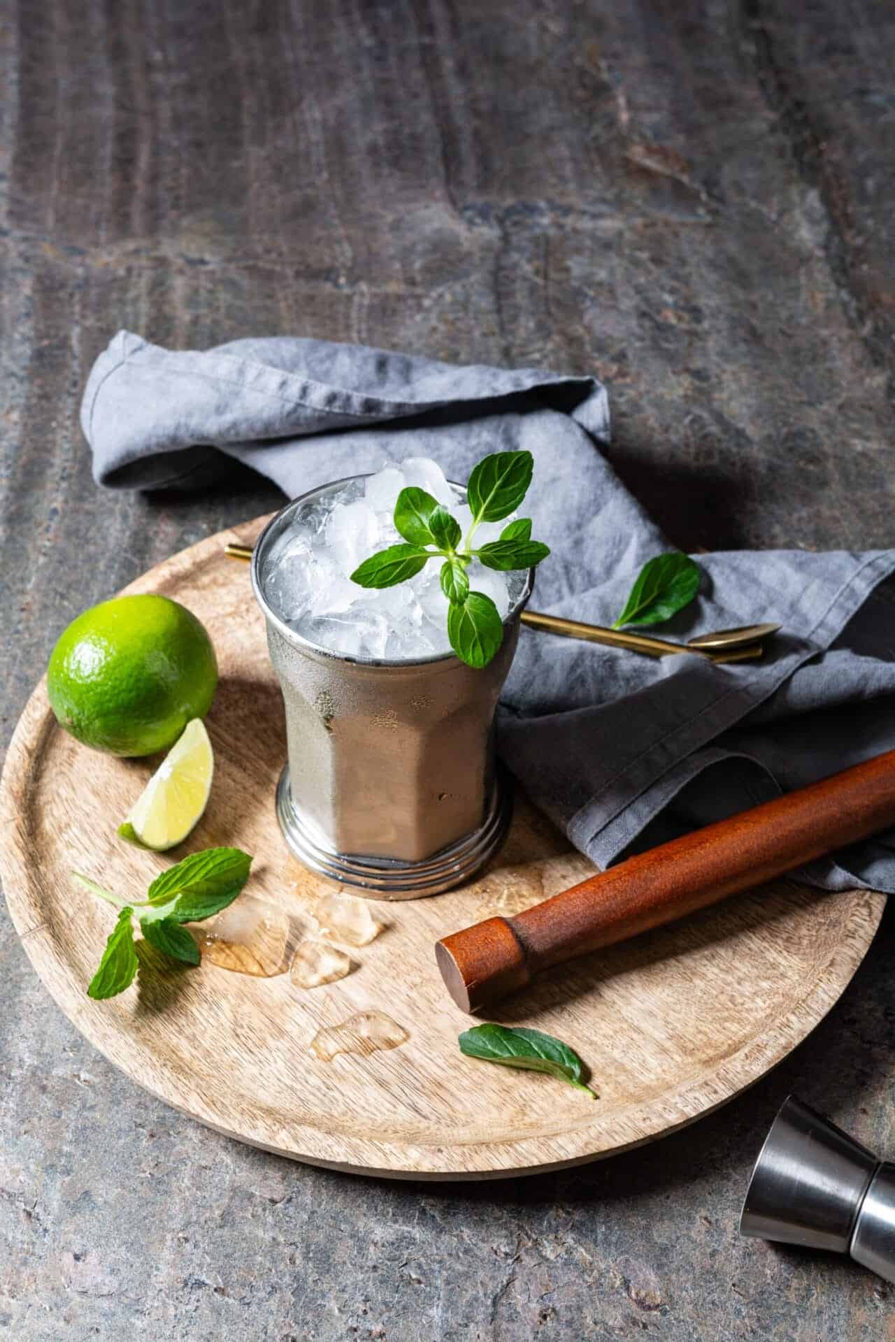 For a traditional way to imbibe, enjoy your drink out of an ice-cold Julep cup. If you don’t have one, a highball glass is always a good choice, garnished with some sprigs of mint for a little extra zest.