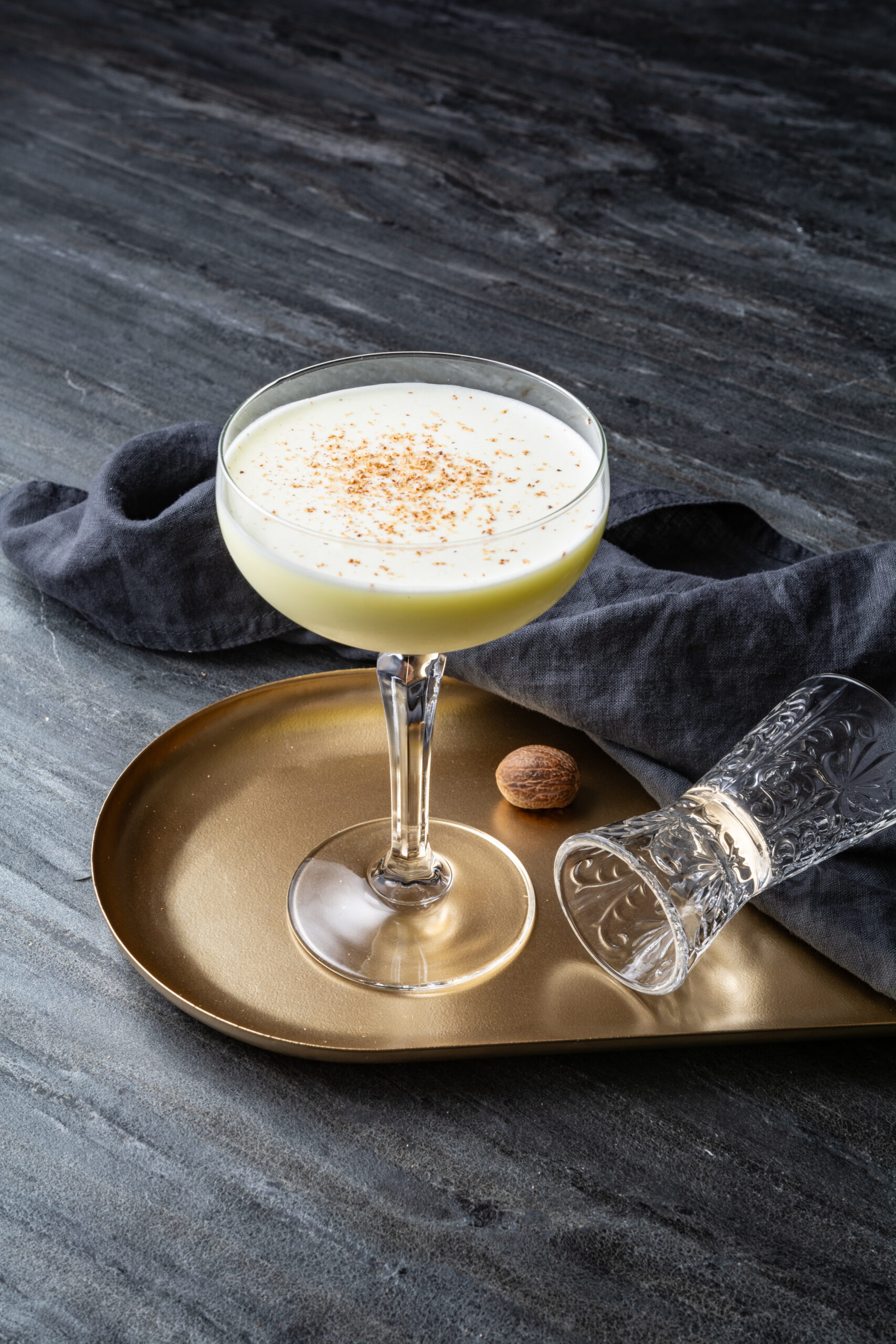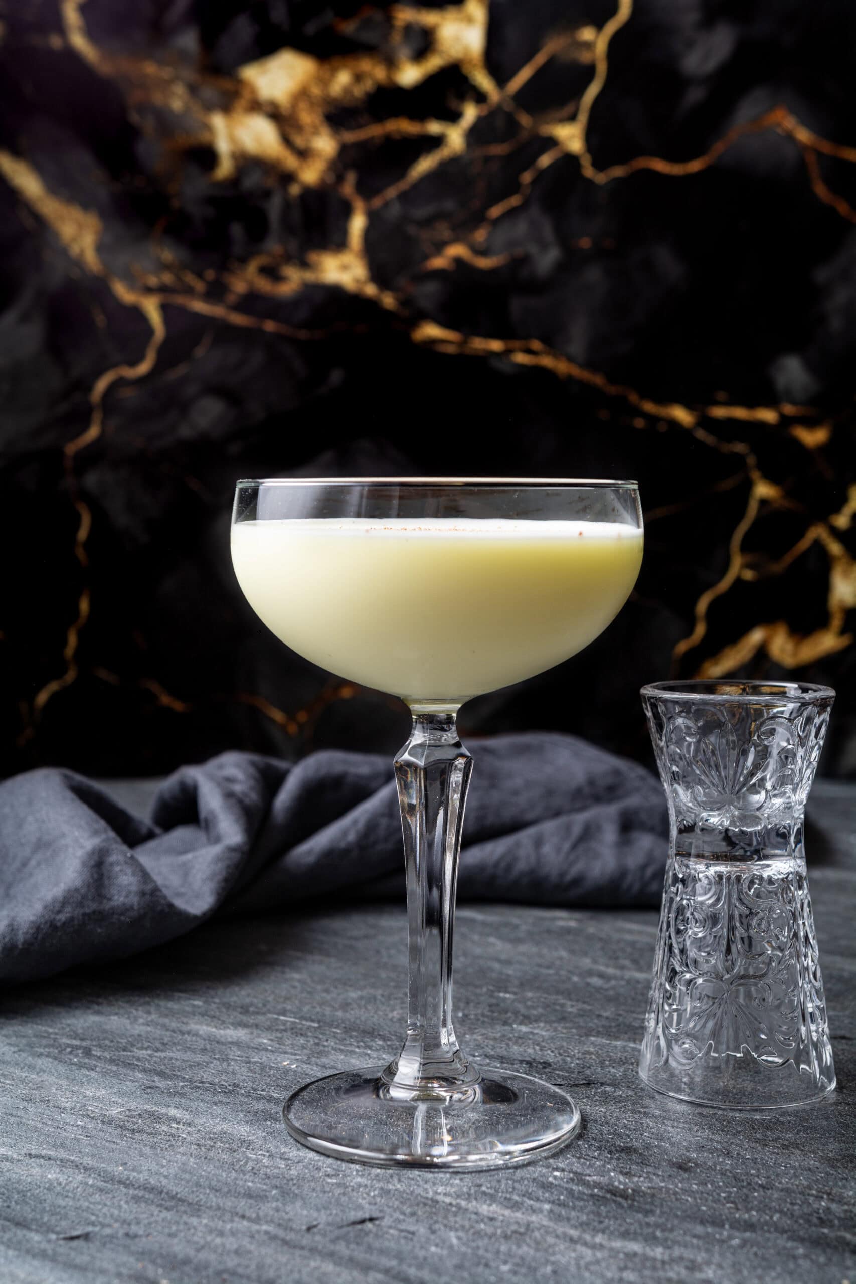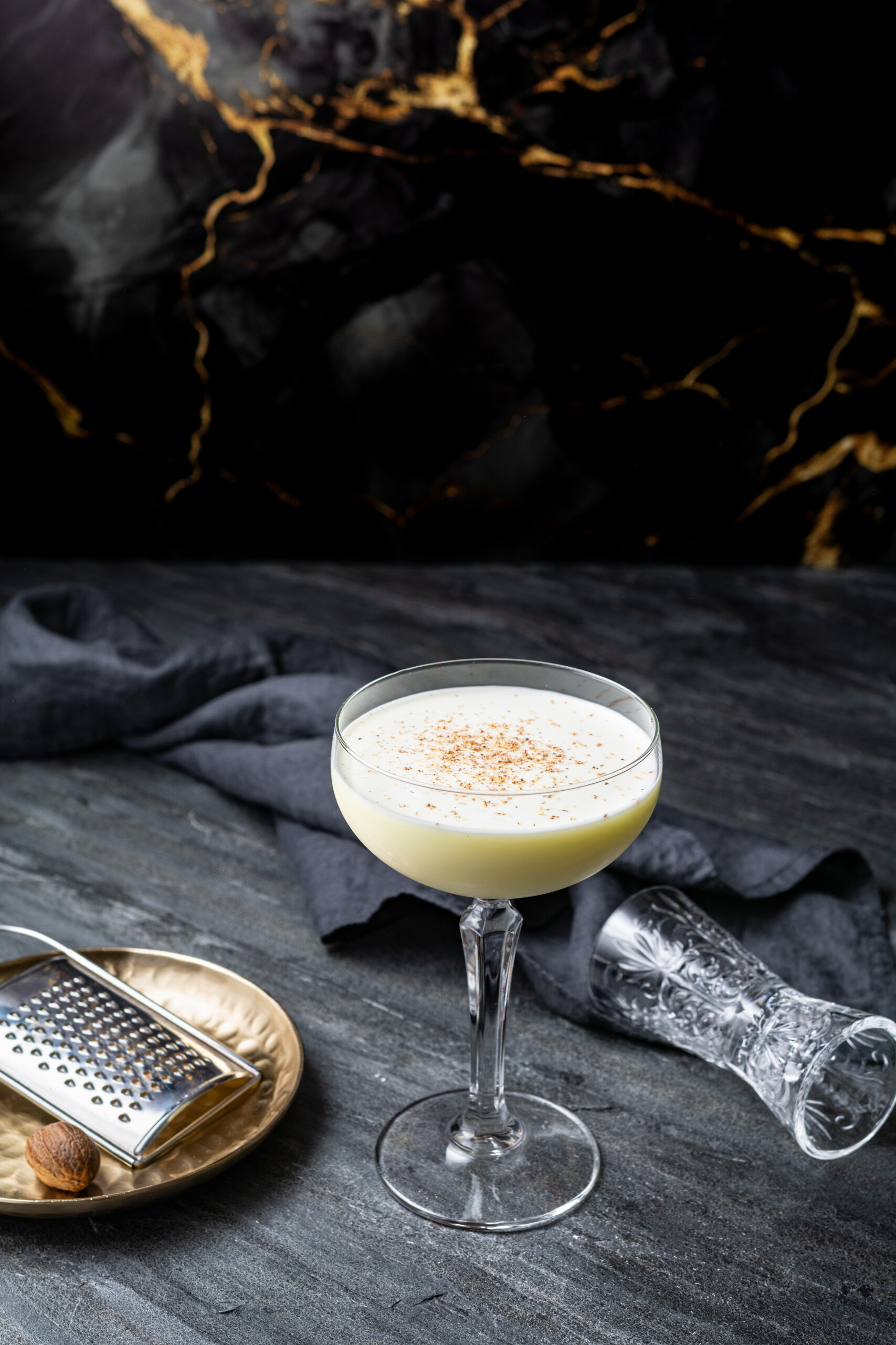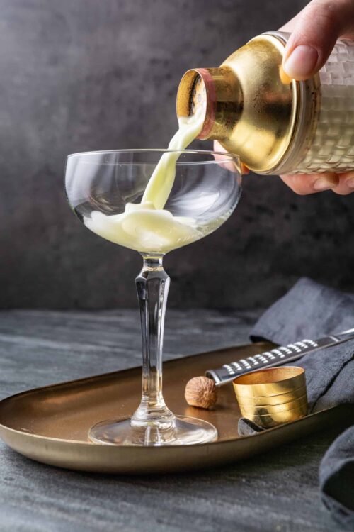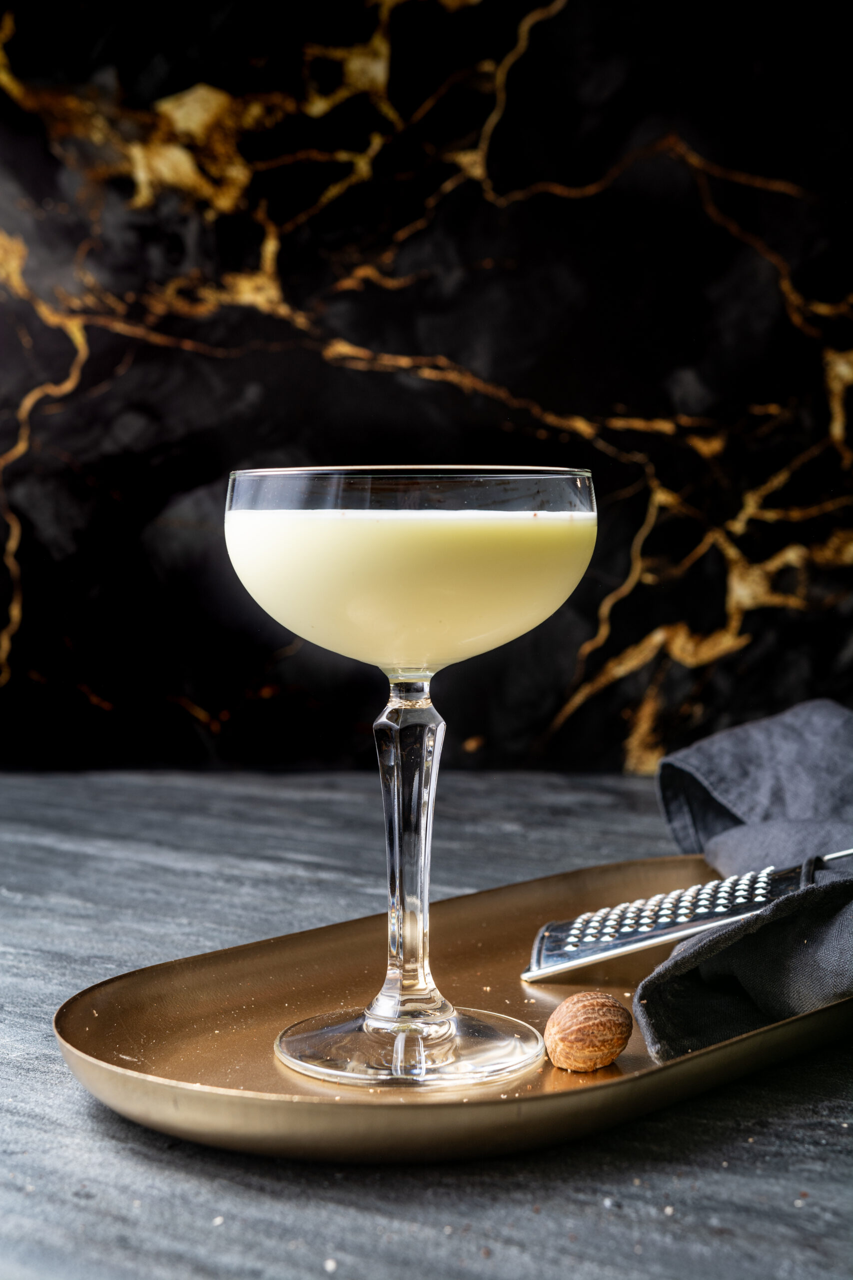 Chill a cocktail coupe in your freezer for about fifteen to thirty minutes. Once your cocktail is poured in, lightly grate some nutmeg or chocolate shavings on top.