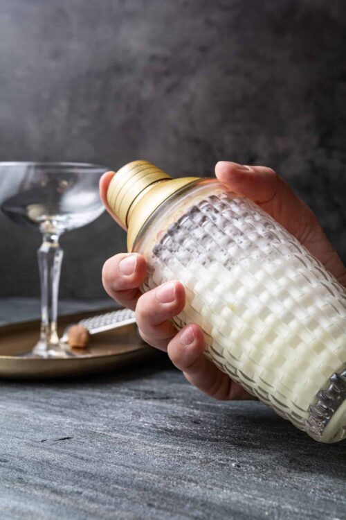 - Strain the mixture into a chilled cocktail glass. Garnish with grated nutmeg or chocolate shavings if desired.