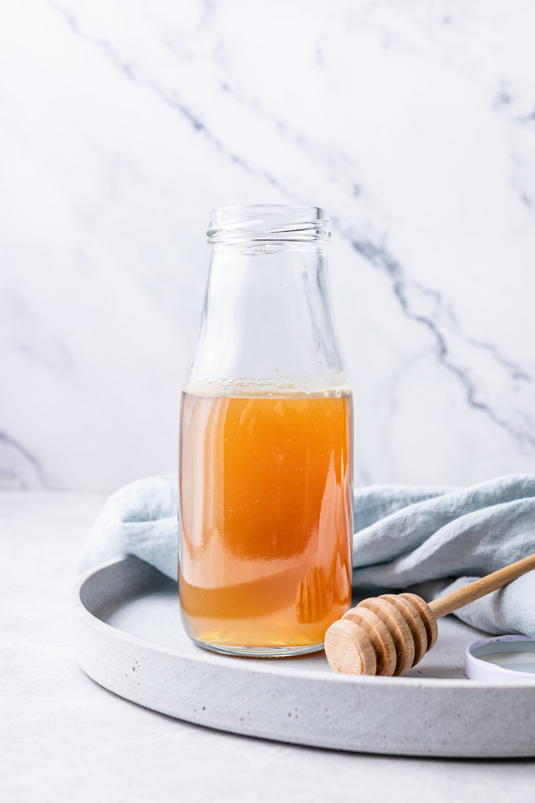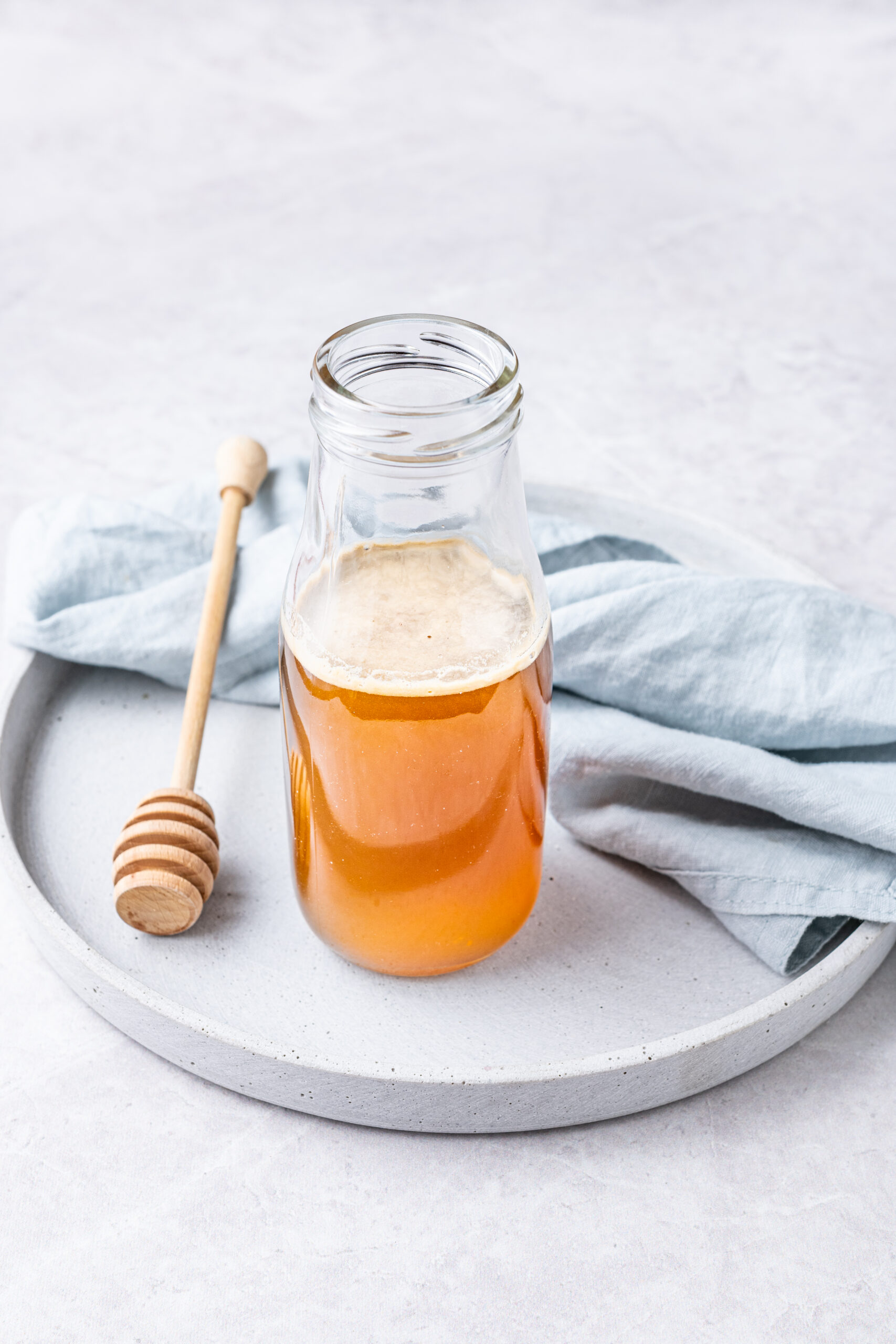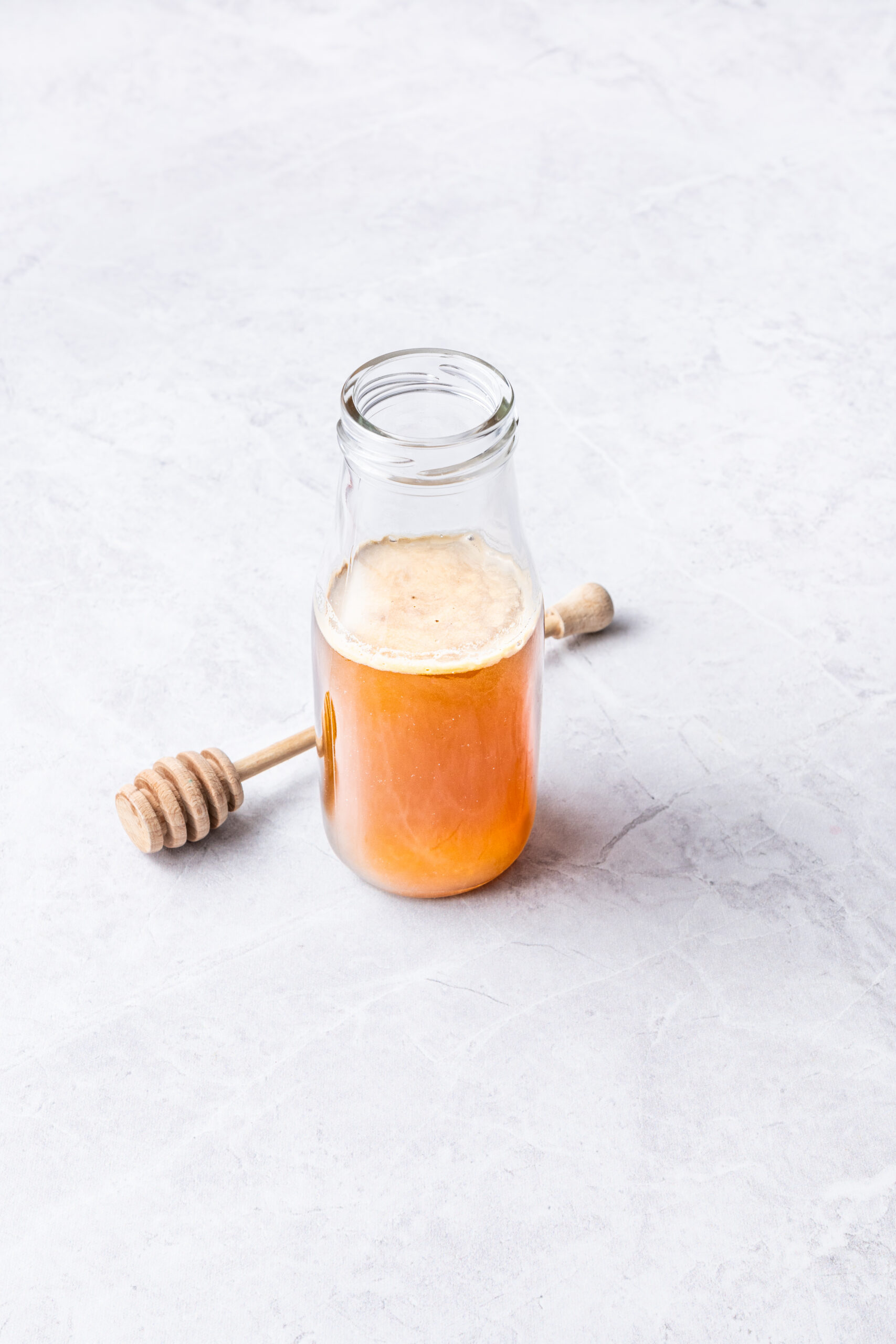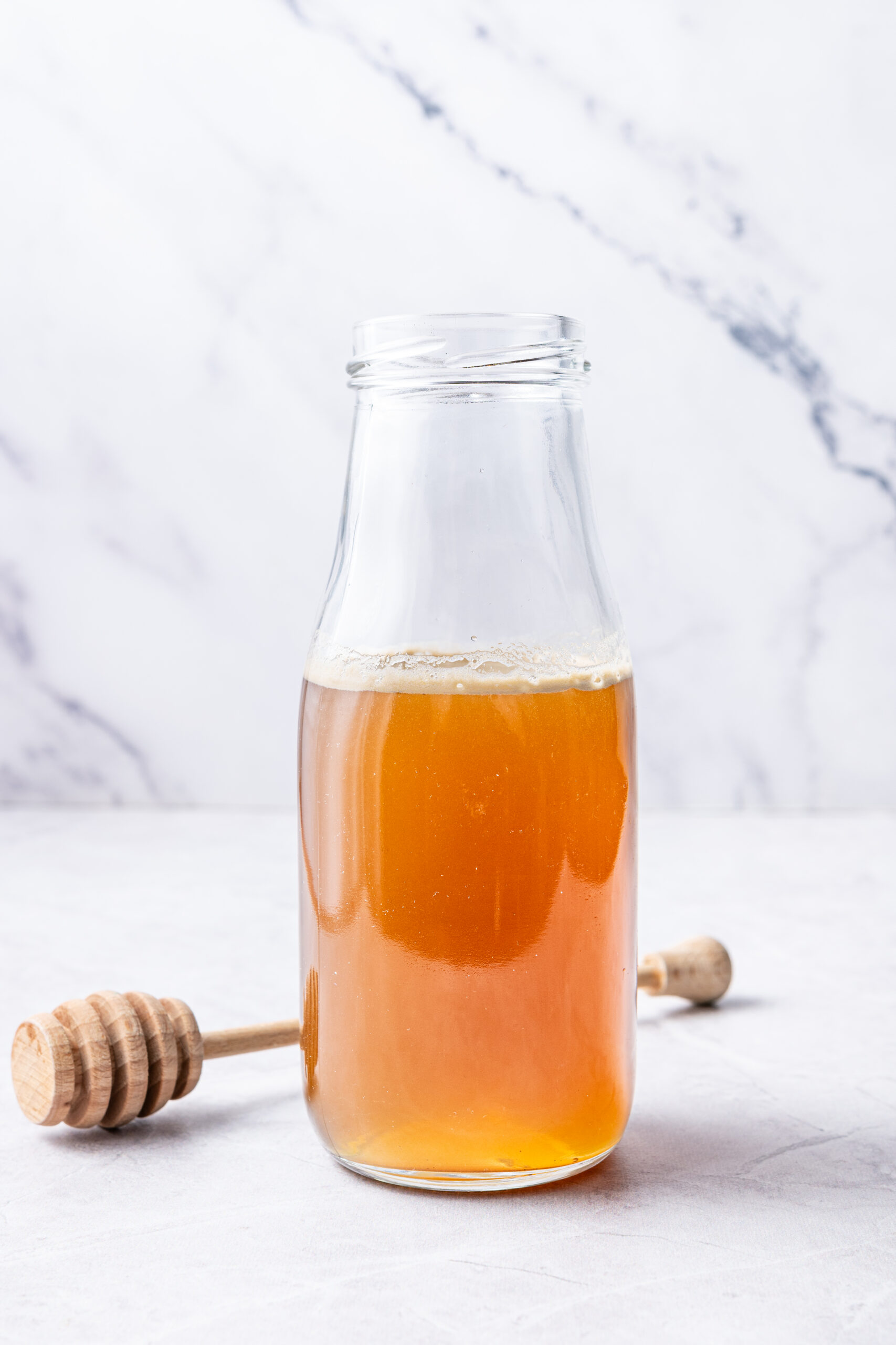 Once your honey syrup is made and cooled down, pour your mixture into a resealable and airtight glass bottle or jar that you can comfortably fit in your fridge.