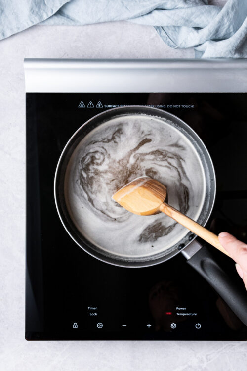 - Place the saucepan over medium heat. Stir continuously until the honey completely dissolves into the water. It should take about 2 minutes.