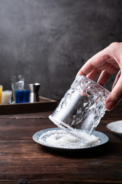 - Pour the corn syrup onto a small plate and spread the shredded coconut flakes on another small plate. Dip the rim of a rocks glass into the corn syrup, then press it into the coconut flakes to create a snowy rim.