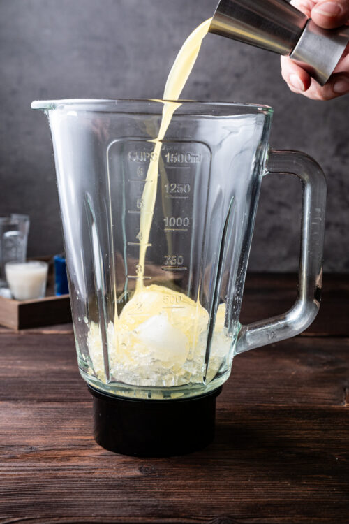 - Add the light rum, curaçao, cream of coconut, pineapple juice, and ice to a blender. Blend on high until smooth.