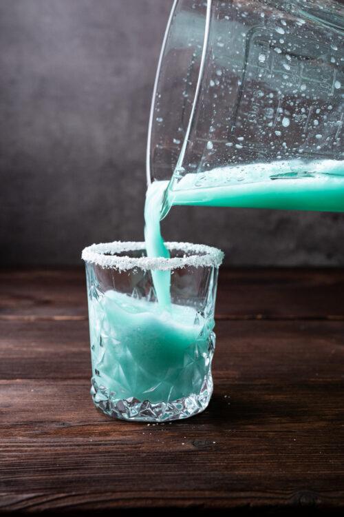 You’ll want a sturdy rocks or Old Fashioned glass to enjoy this snowy-looking cocktail. Once you’ve garnished the rim with coconut shavings, pour your blended concoction in and enjoy.