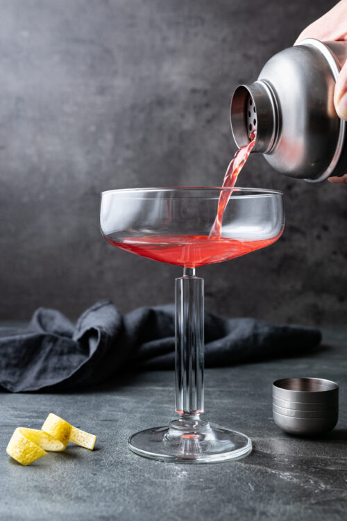 - Fine strain into a chilled coupe glass. Twist a lemon peel over the drink to release its oils, then use it as garnish.