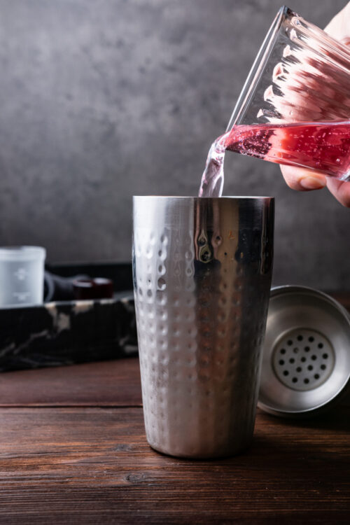- Pour the vodka, pink lemonade, and lime juice into a cocktail shaker filled with ice.