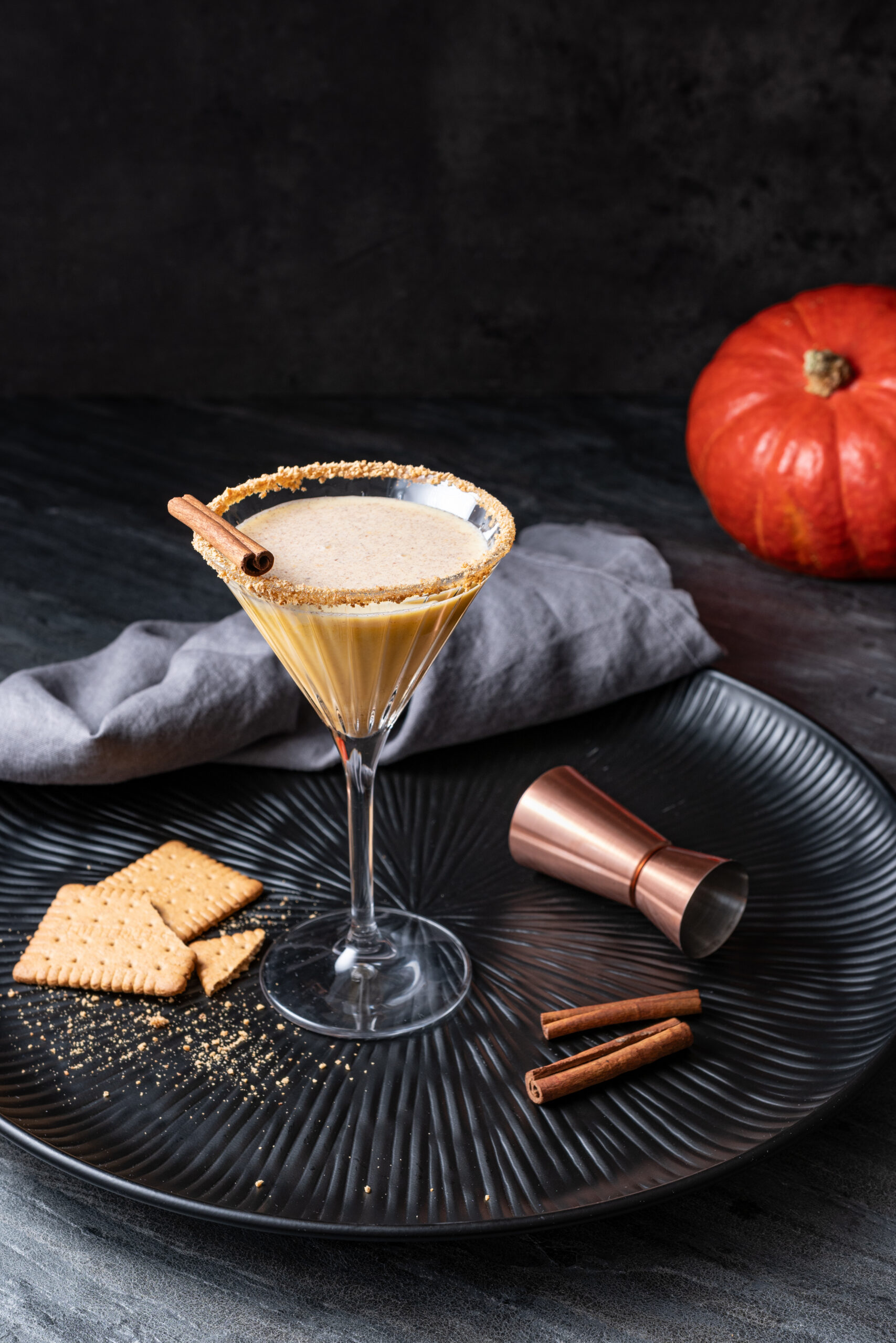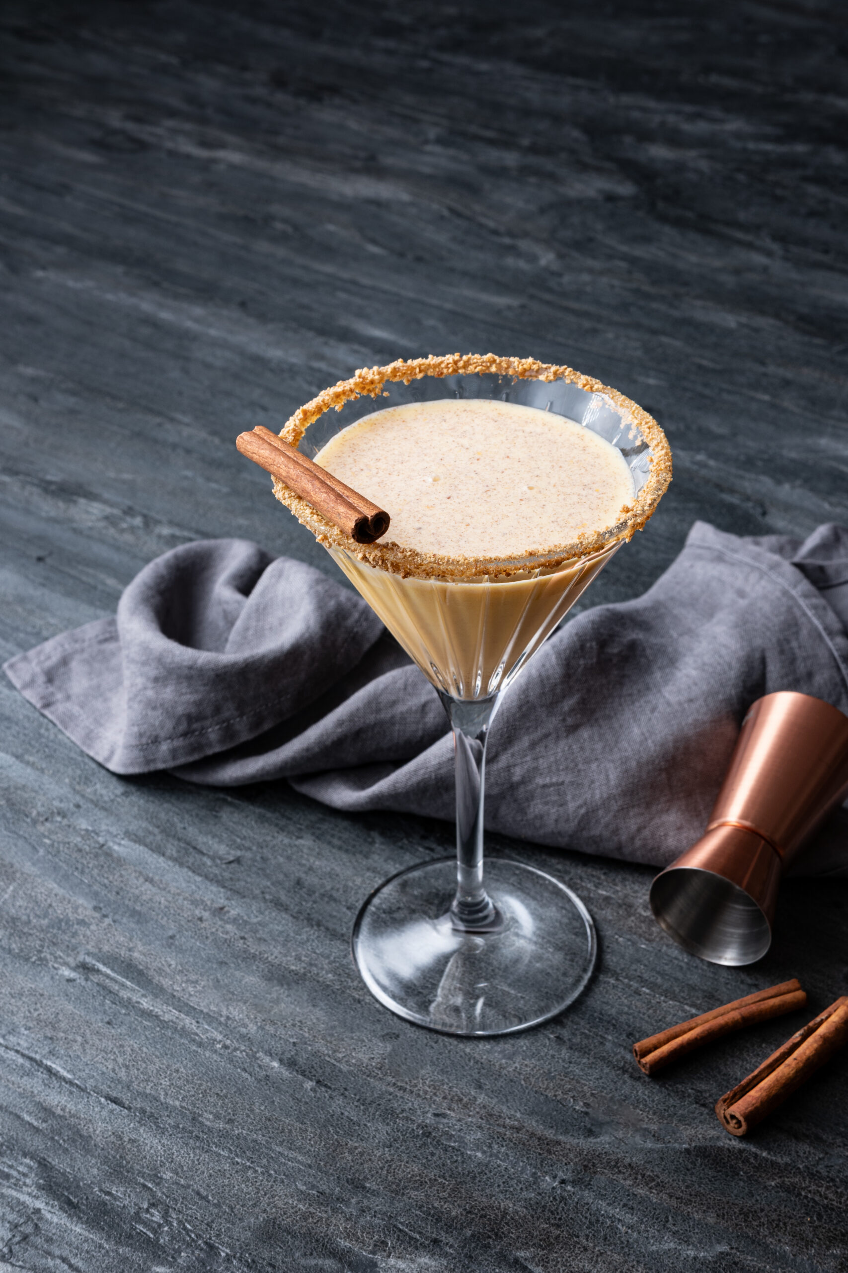 Chill a long-stemmed martini glass or cocktail coupe in your freezer for up to 30 minutes before prepping and serving your drink. Dip the rim in maple syrup, line it with graham cracker crumbles and pour your libation in, garnishing with a cinnamon stick or two on top.