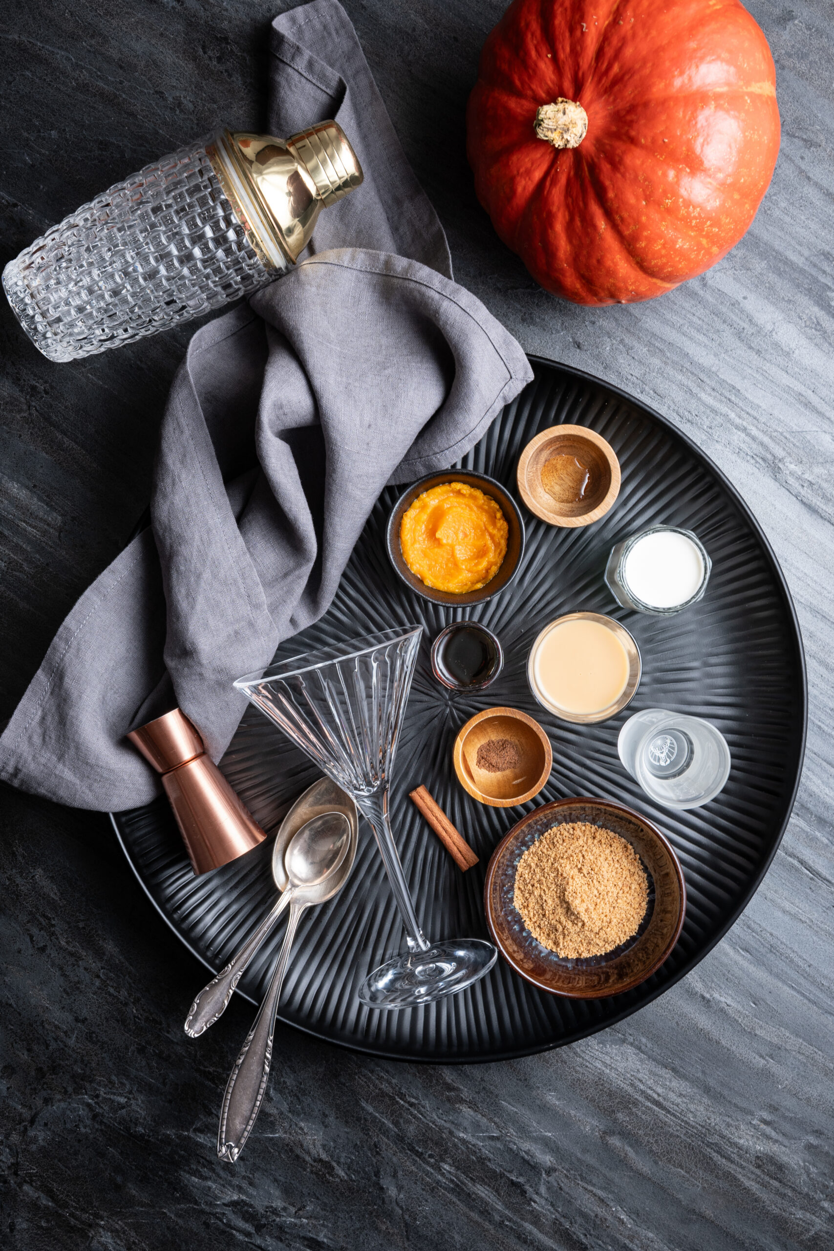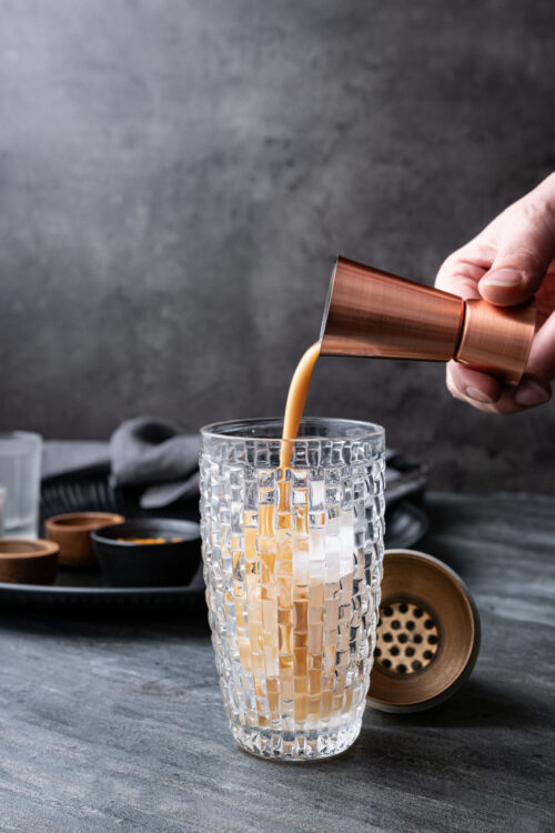 - In a cocktail shaker filled with ice, add the vodka, Irish cream, cream, pumpkin purée, maple syrup, pumpkin pie spice, and vanilla extract.