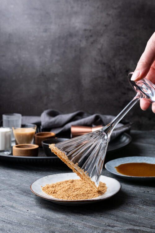 - Dip the rim of your martini glass in a little maple syrup, then roll the rim in the graham cracker crumbs until evenly coated.