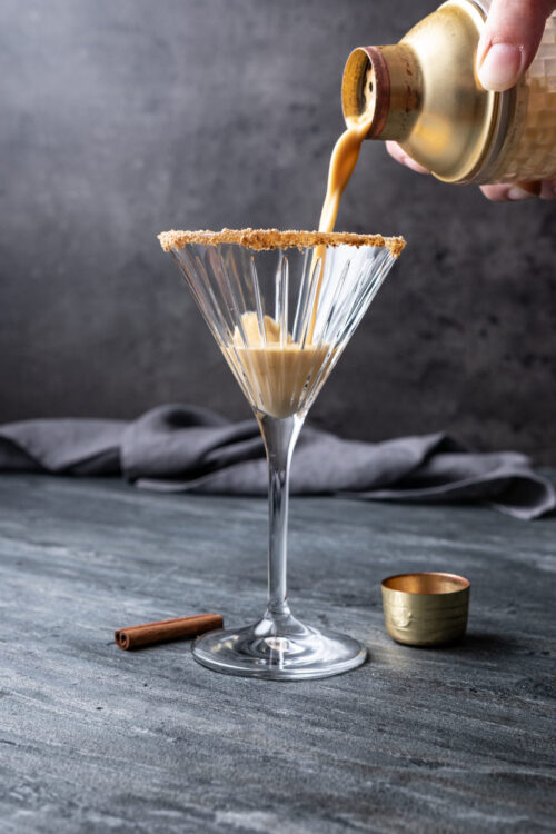 - Shake well and strain into your prepared martini glass. Garnish with a cinnamon stick.