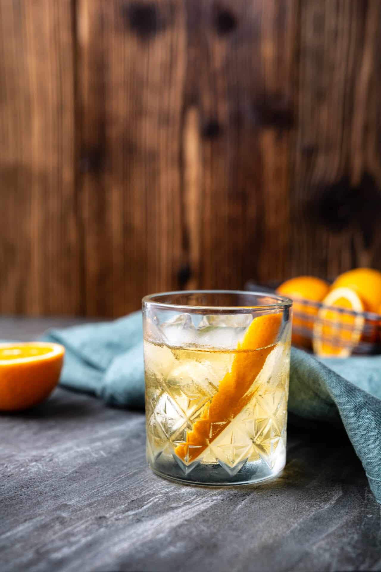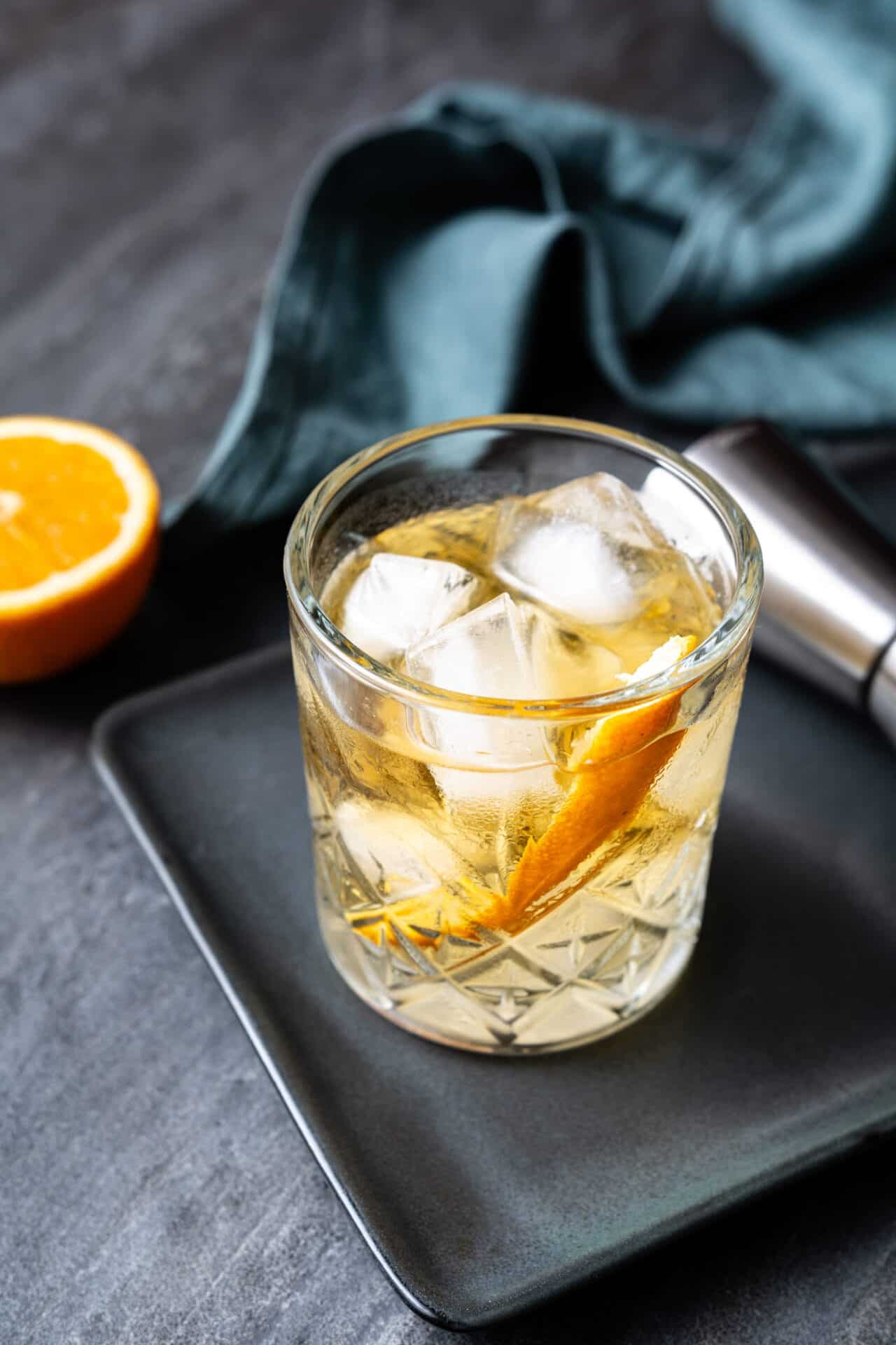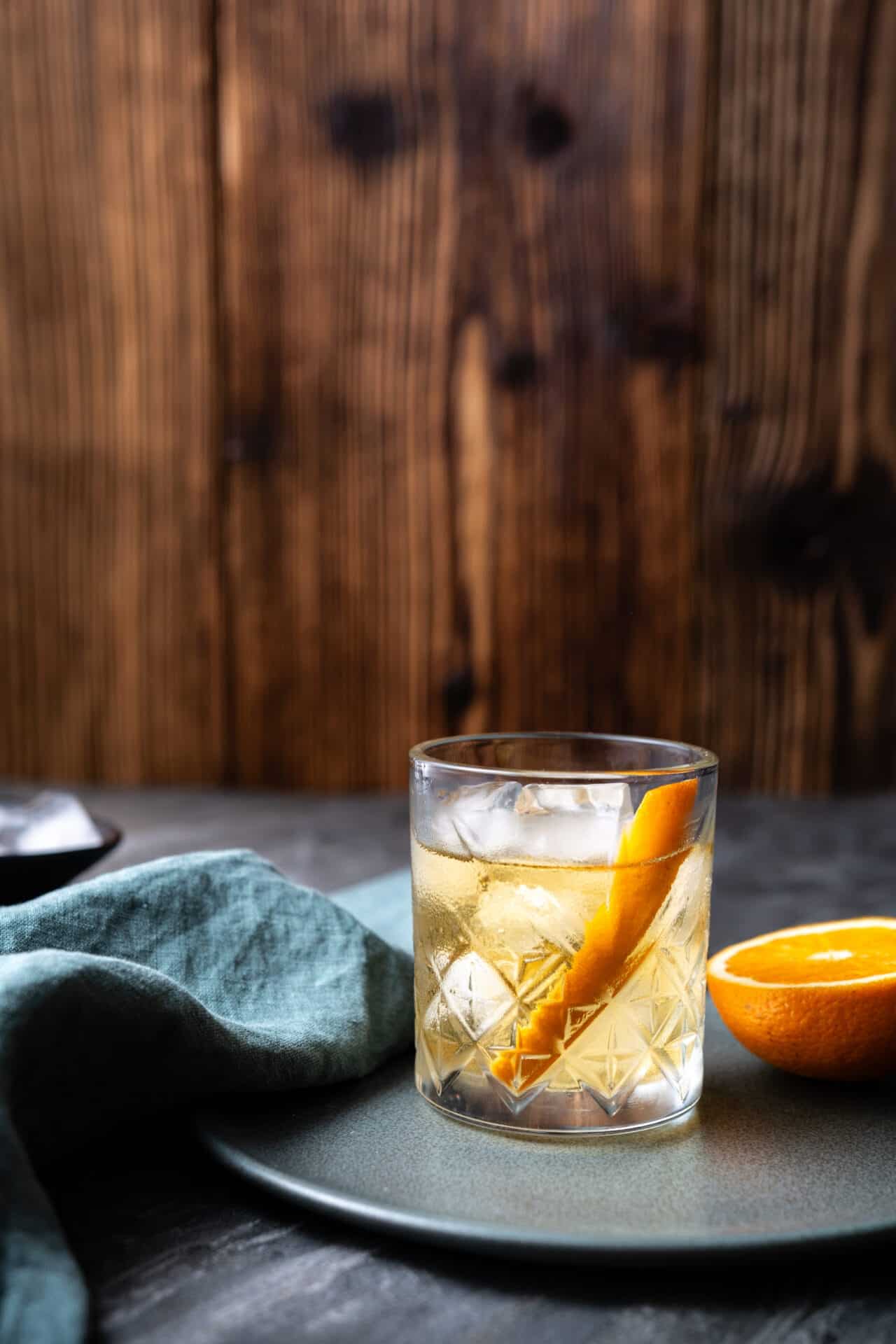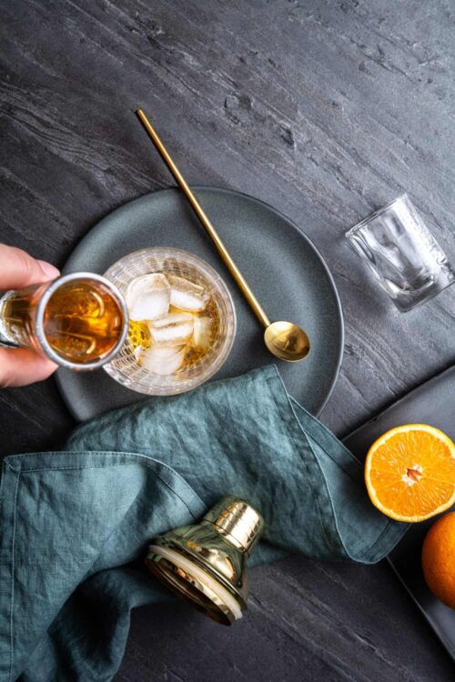- Strain the cocktail into a rocks glass that is full of fresh ice cubes.