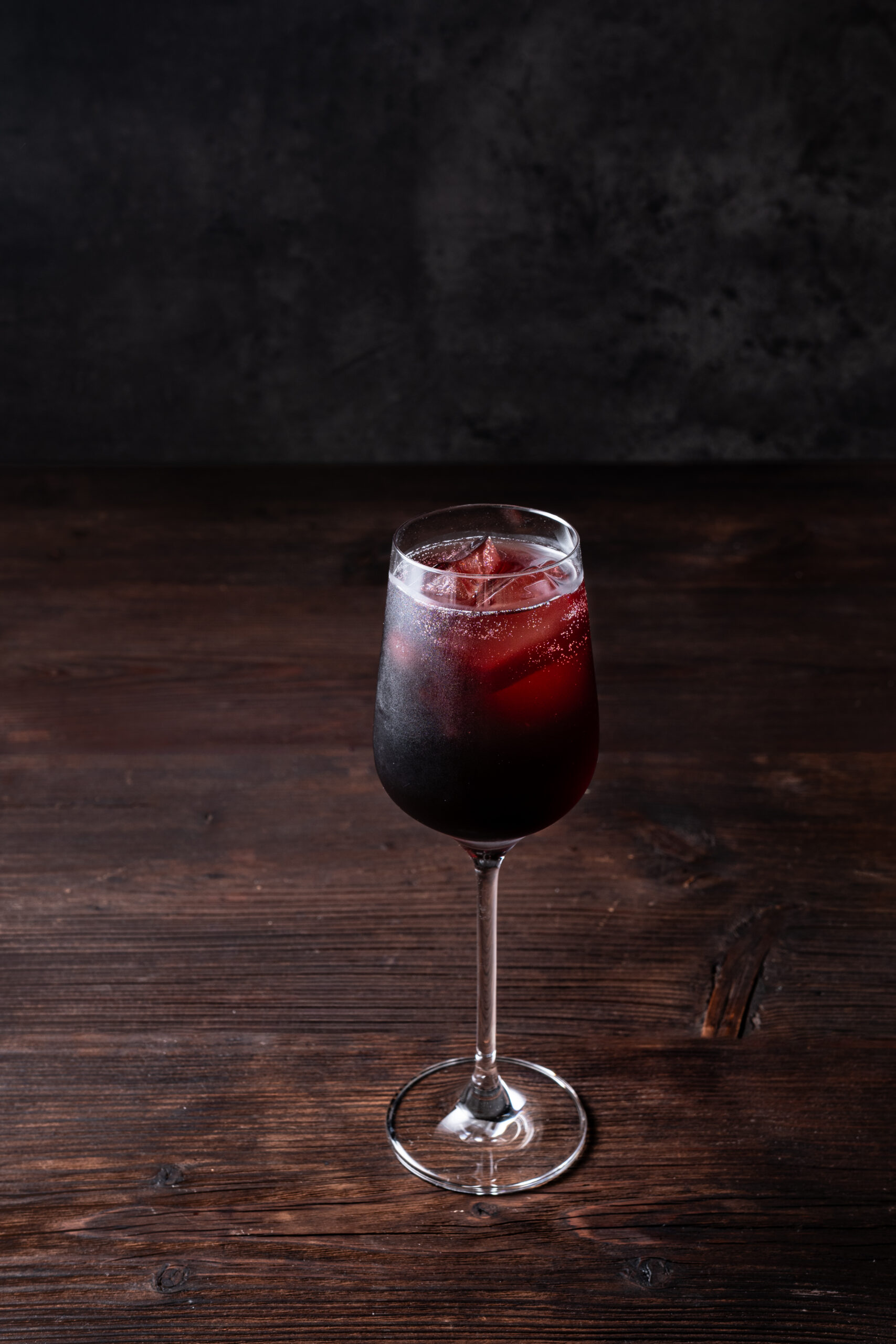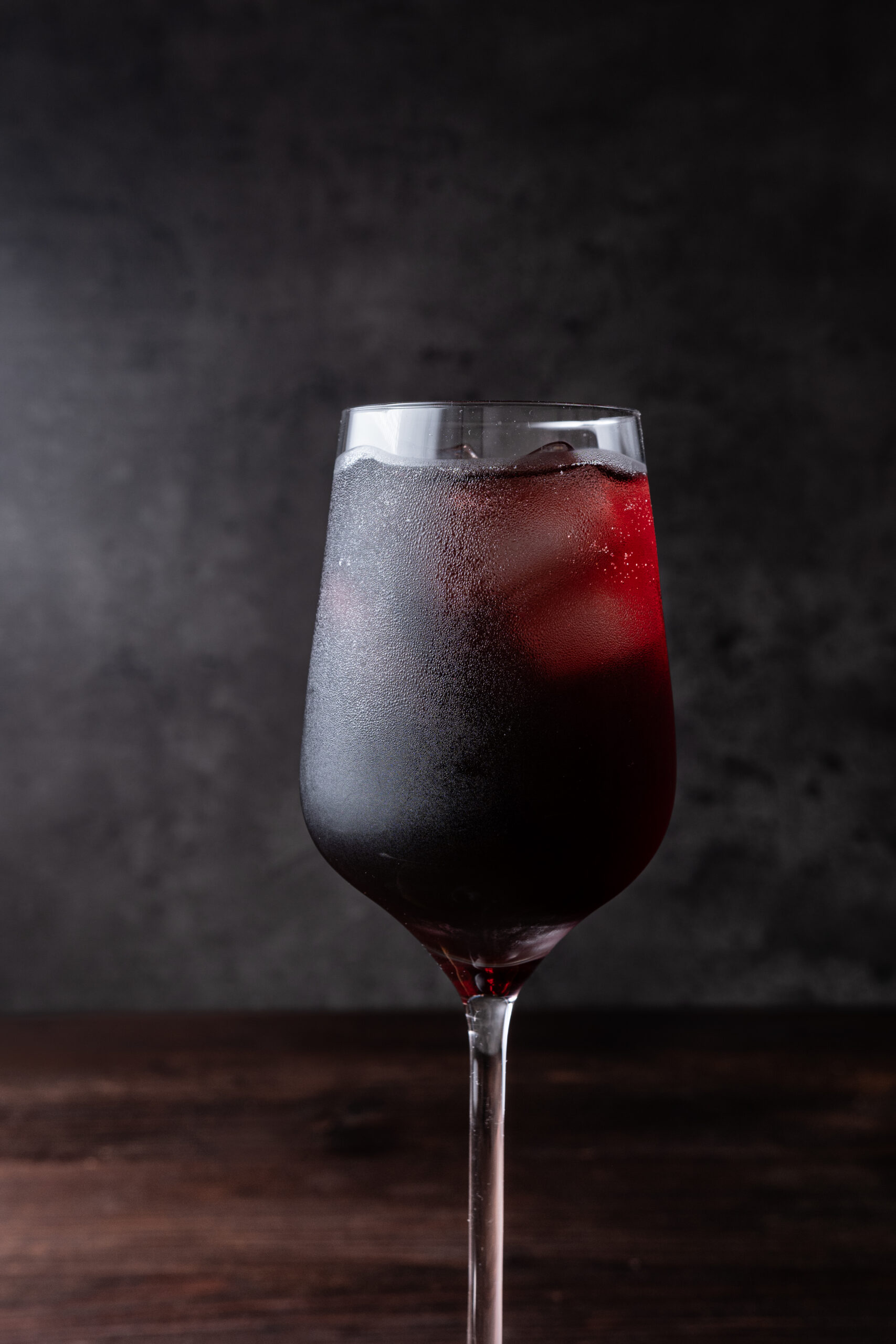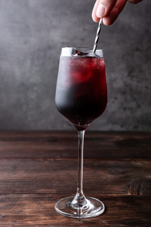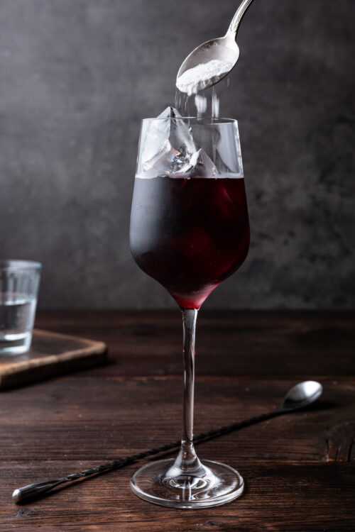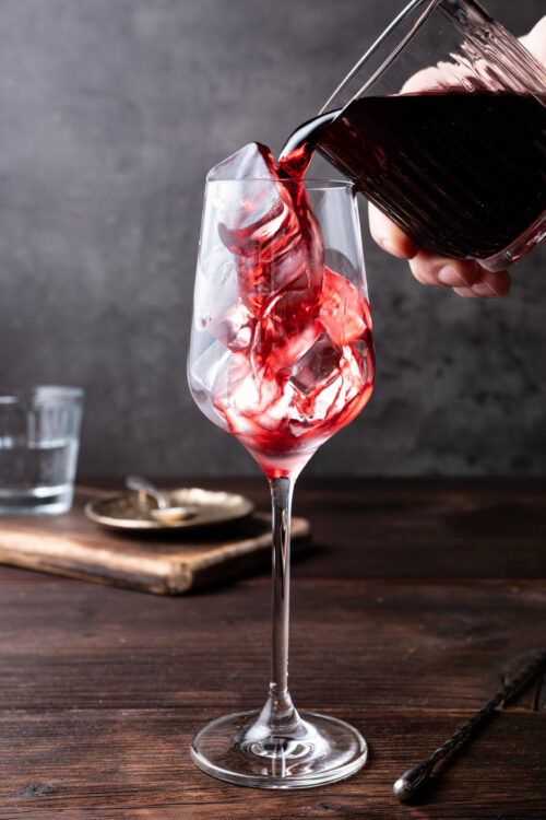 - Fill a wine glass with ice and pour in the tart cherry juice.
