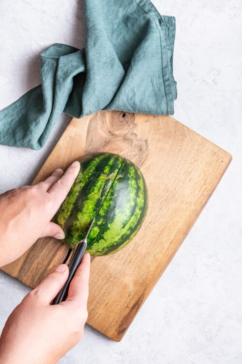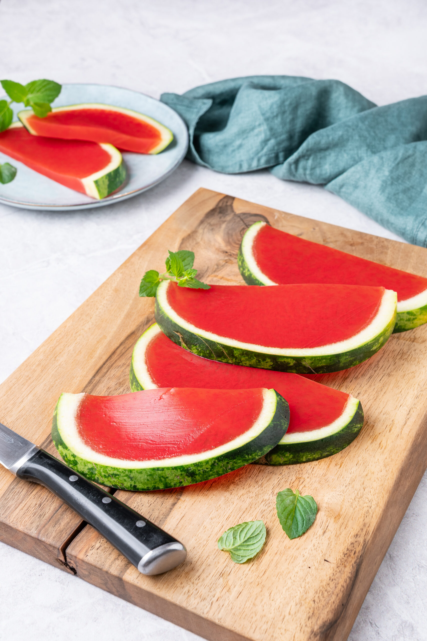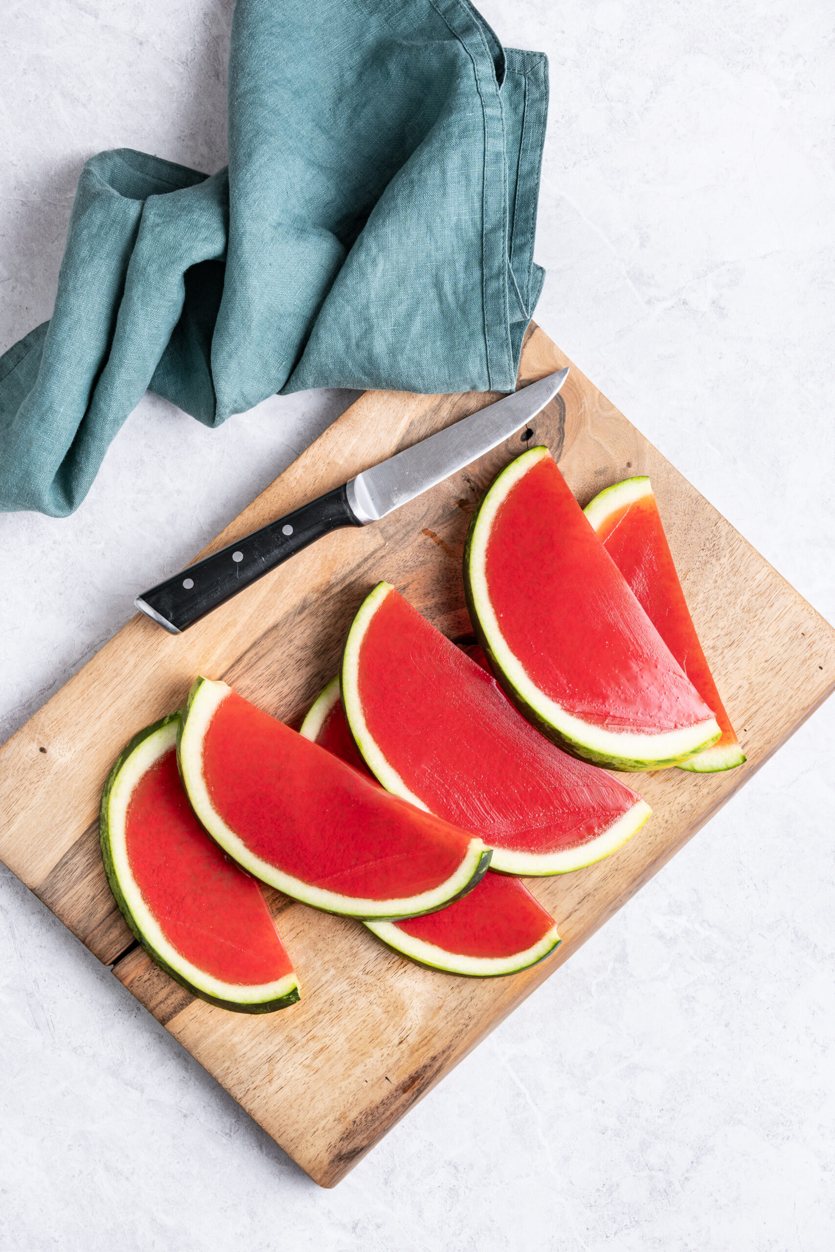 - Once completely set, place a watermelon half Jell-O-side down on a cutting board. Use a large, sharp knife to cut it into 1-inch wedges.