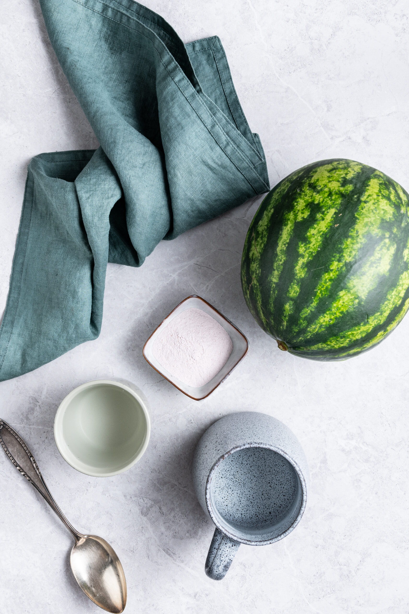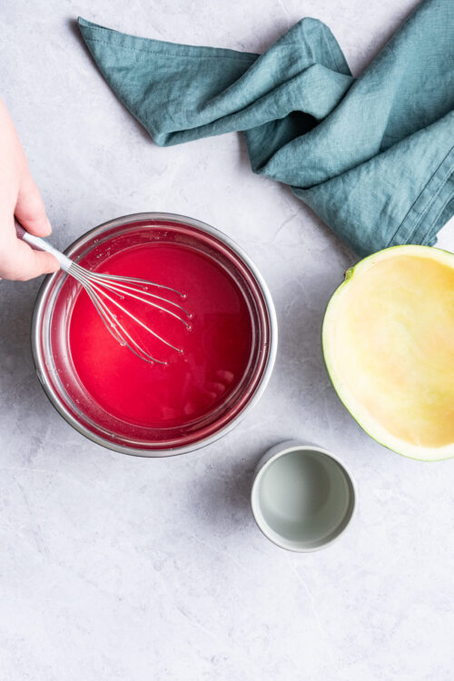 - Pour your 1 cup of chilled watermelon juice into a large mixing bowl. Sprinkle the packet of unflavored gelatin evenly over the surface. Let it sit undisturbed for 5 minutes.