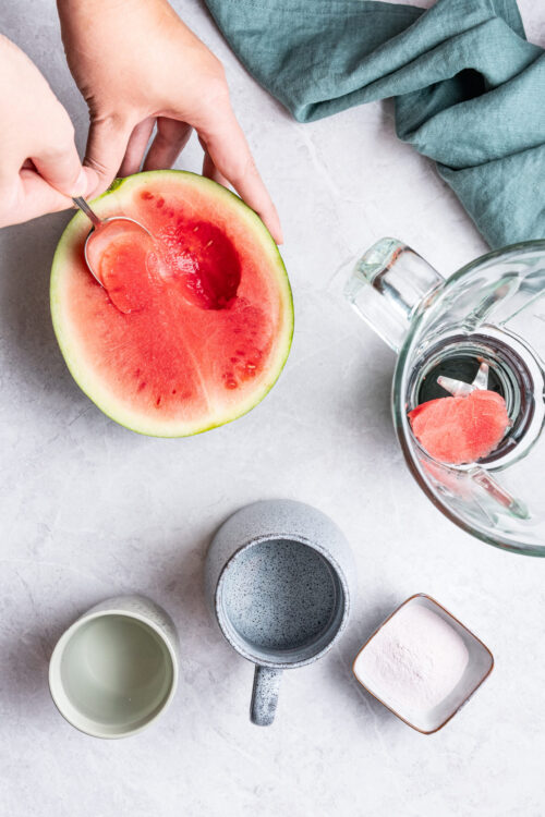 - Take about 2 cups of the scooped-out flesh and place it in a blender. Blend until completely smooth and sieve it through a fine-mesh. You need 1 cup of strained watermelon juice. Chill it in the fridge.