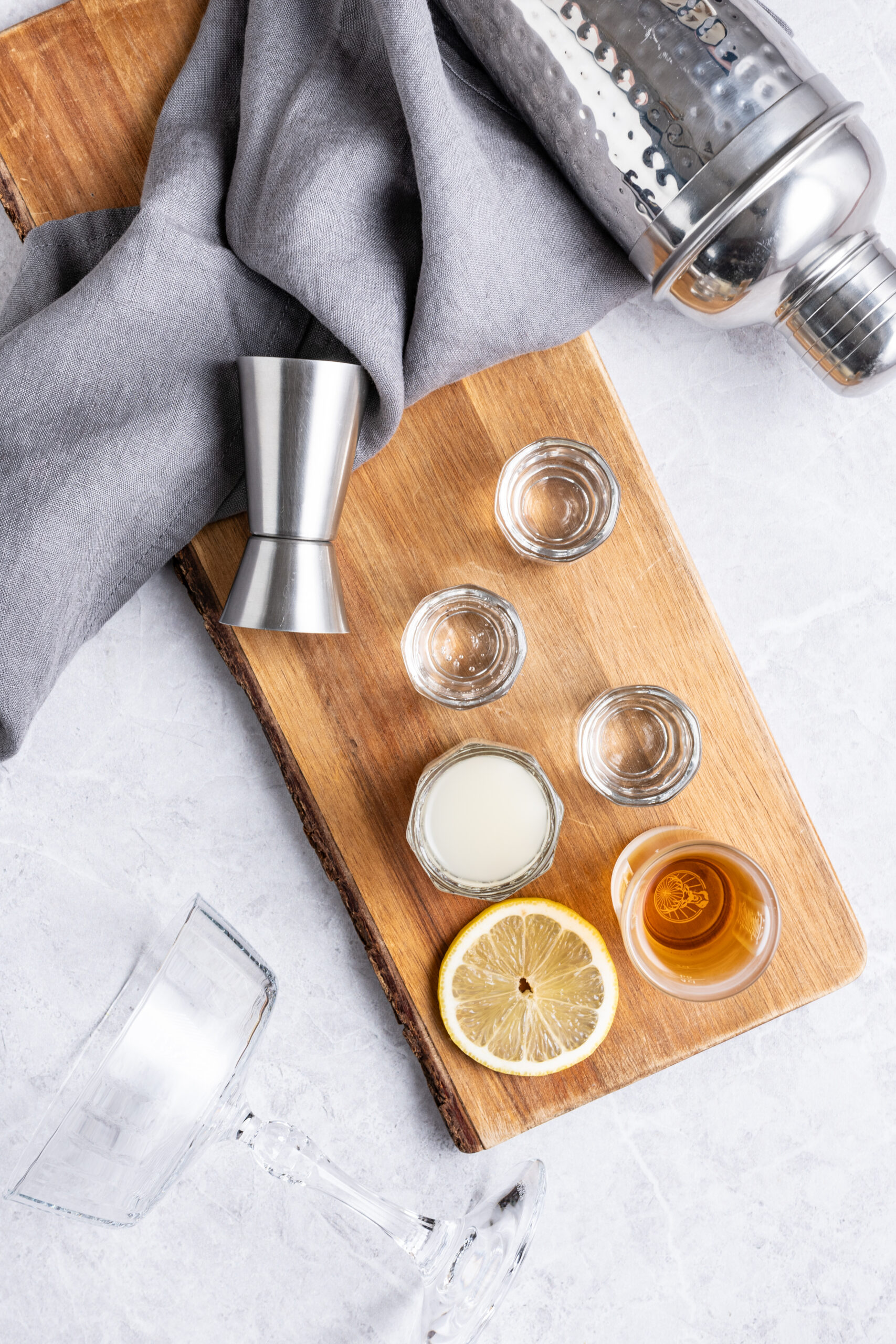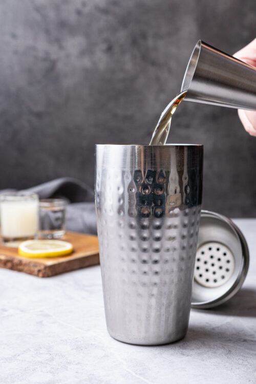 - Add the whiskey, lemon juice, orange liqueur, and simple syrup to a cocktail shaker filled with ice.