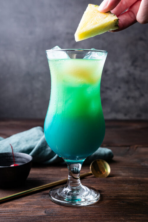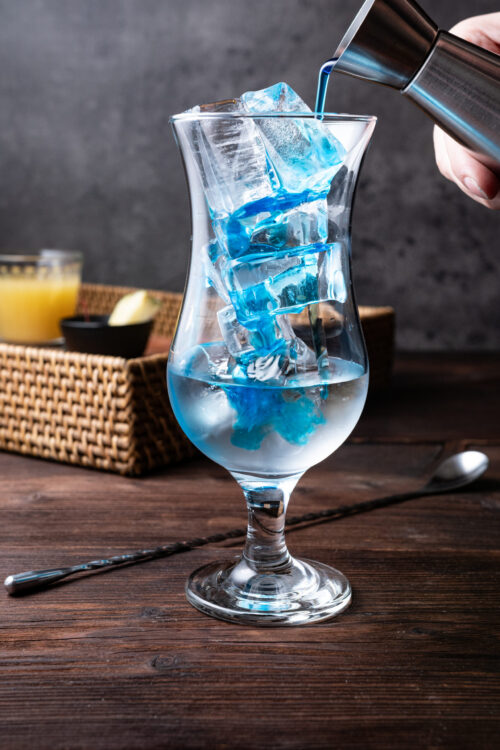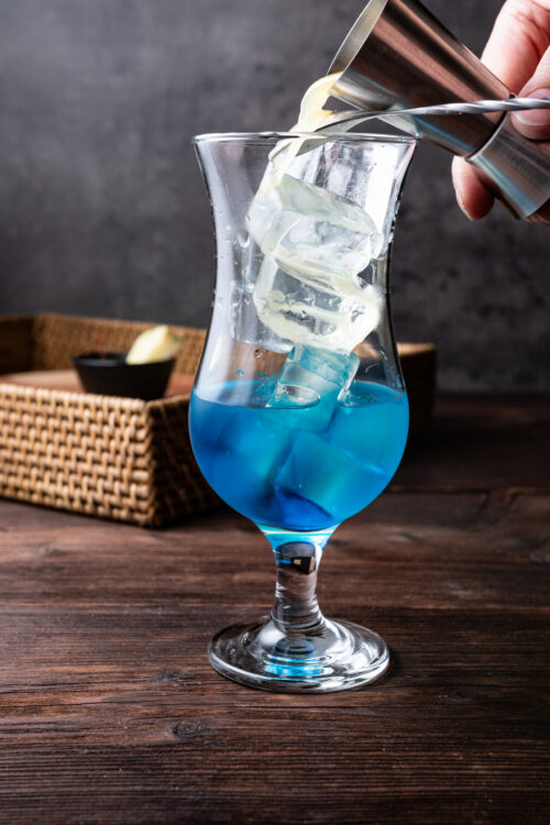 Fill a hurricane glass with ice. Add the coconut rum and blue curaçao over the ice.